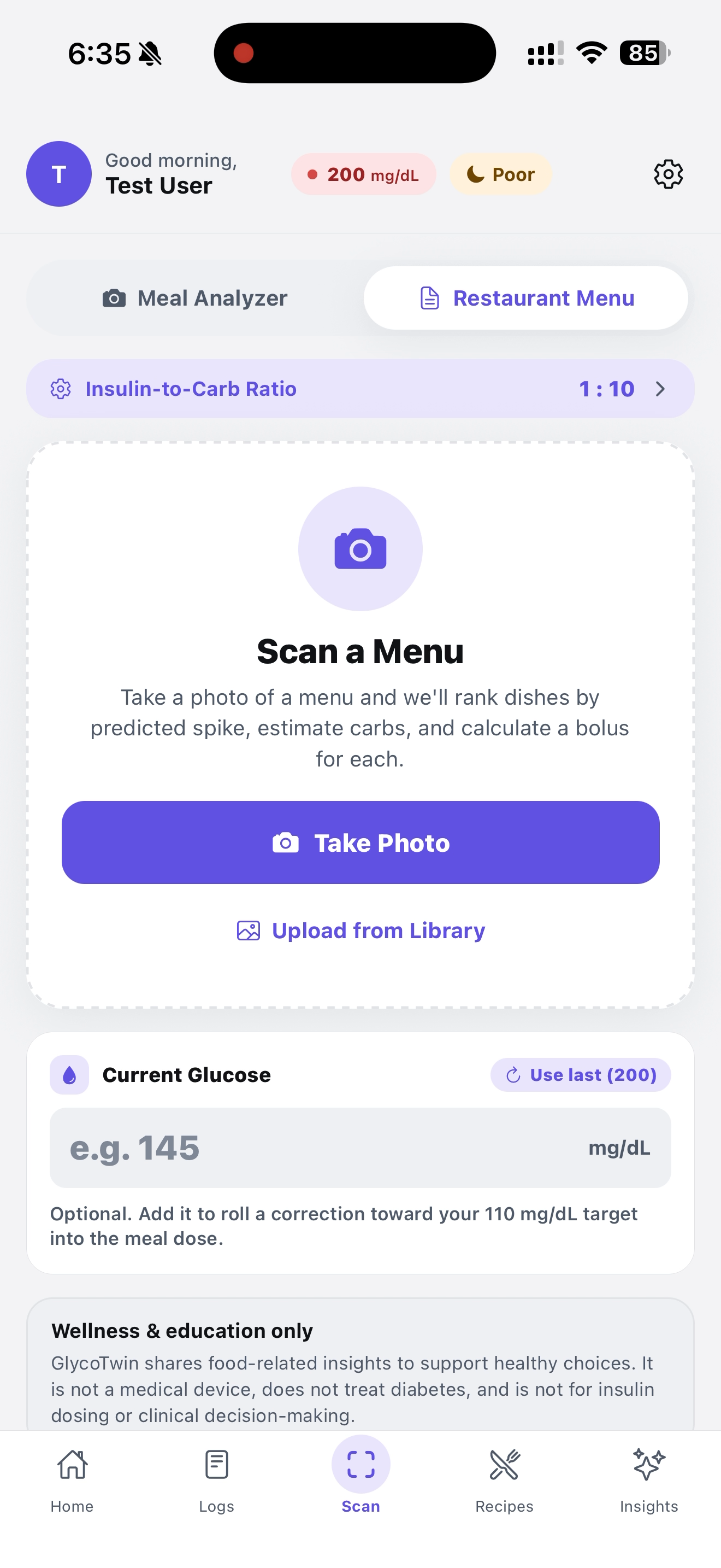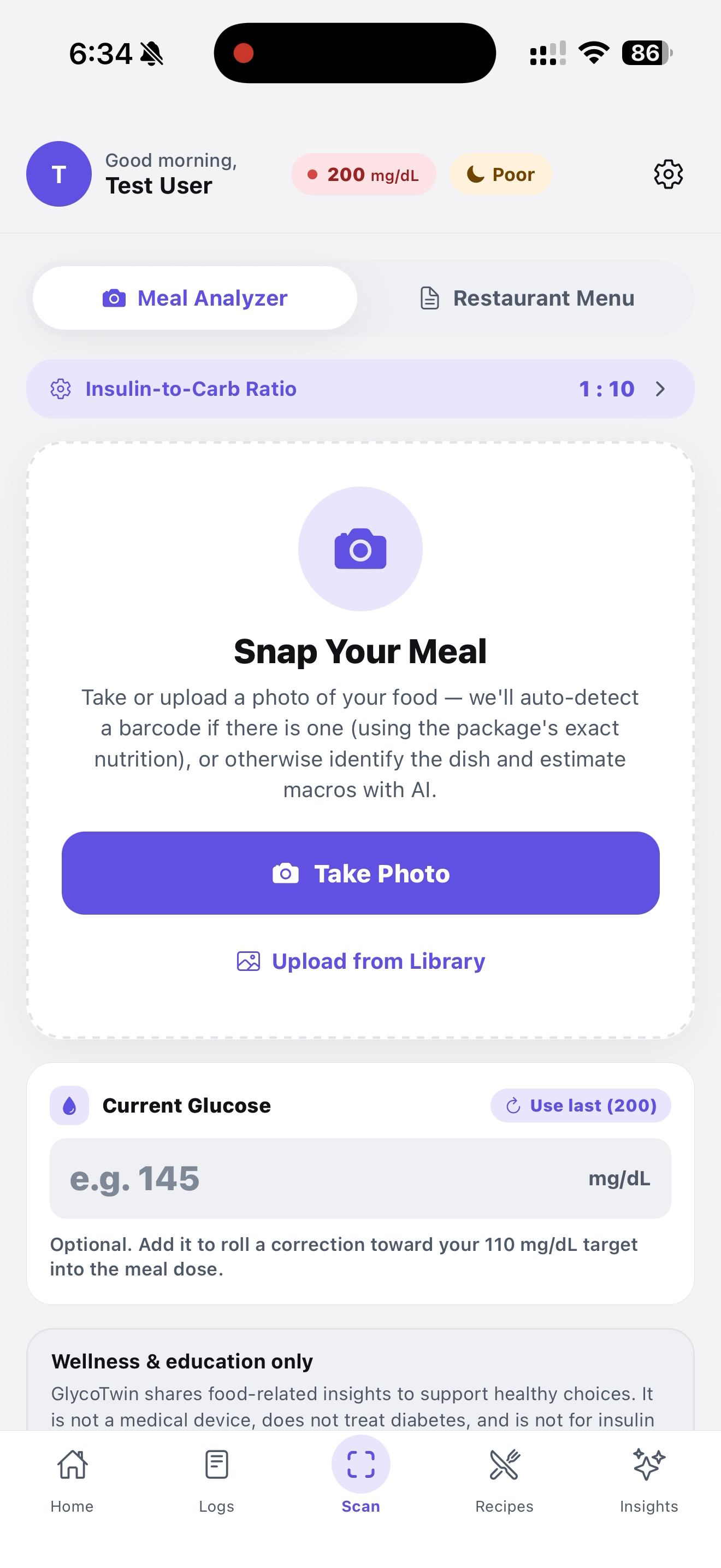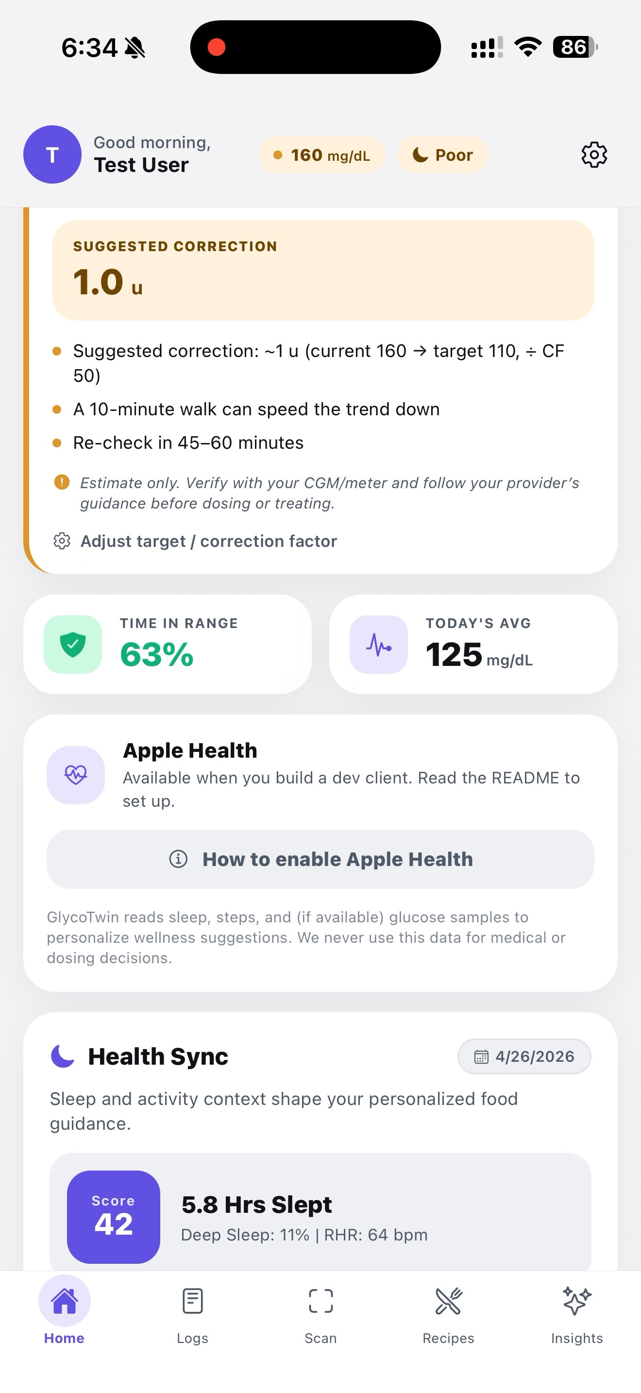 - Log + learn — every meal, glucose reading, and sleep snapshot is stored, charted, and folded into the model.
