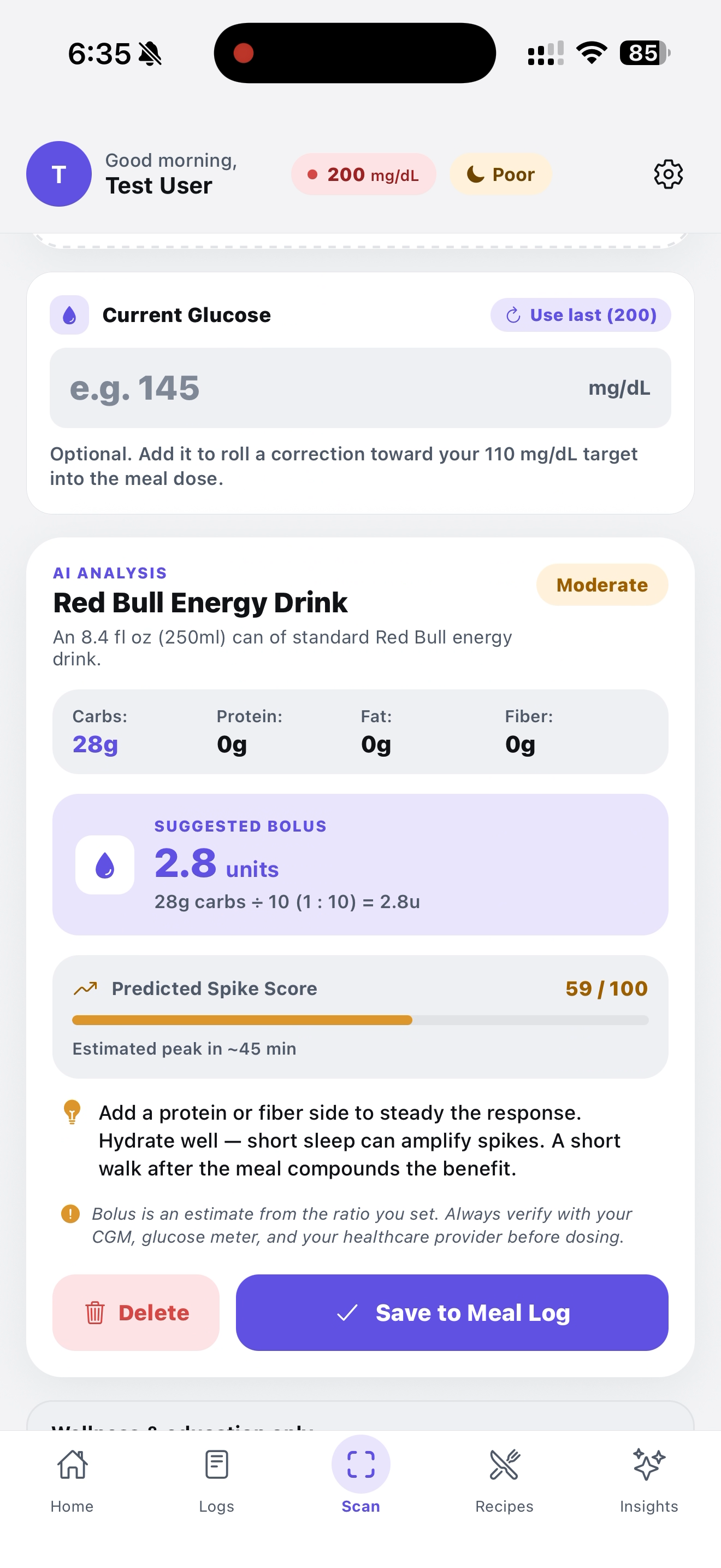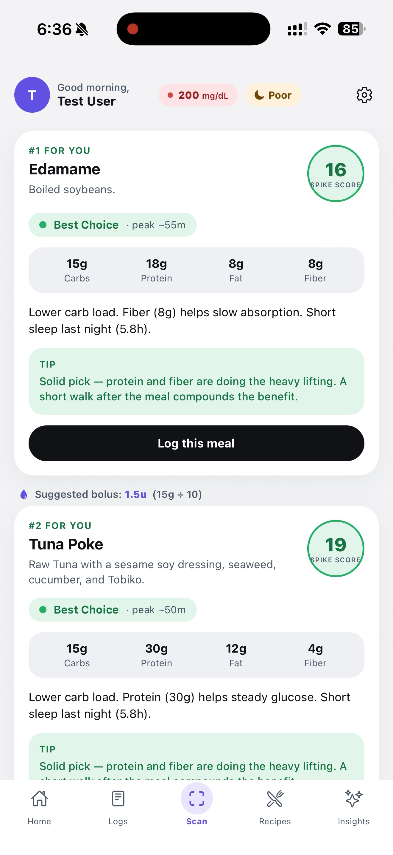 zxing-wasmdecodes UPC/EAN codes server-side, then we query Open Food Facts and normalize per-100g nutrition into a smart default serving size using a layered system of category tags, name patterns, and label data. - Prediction engine: A custom scoring function that weights carbs, fiber, protein, sleep deficit, activity, and food category to produce a 0–100 spike score and a recommended action.
