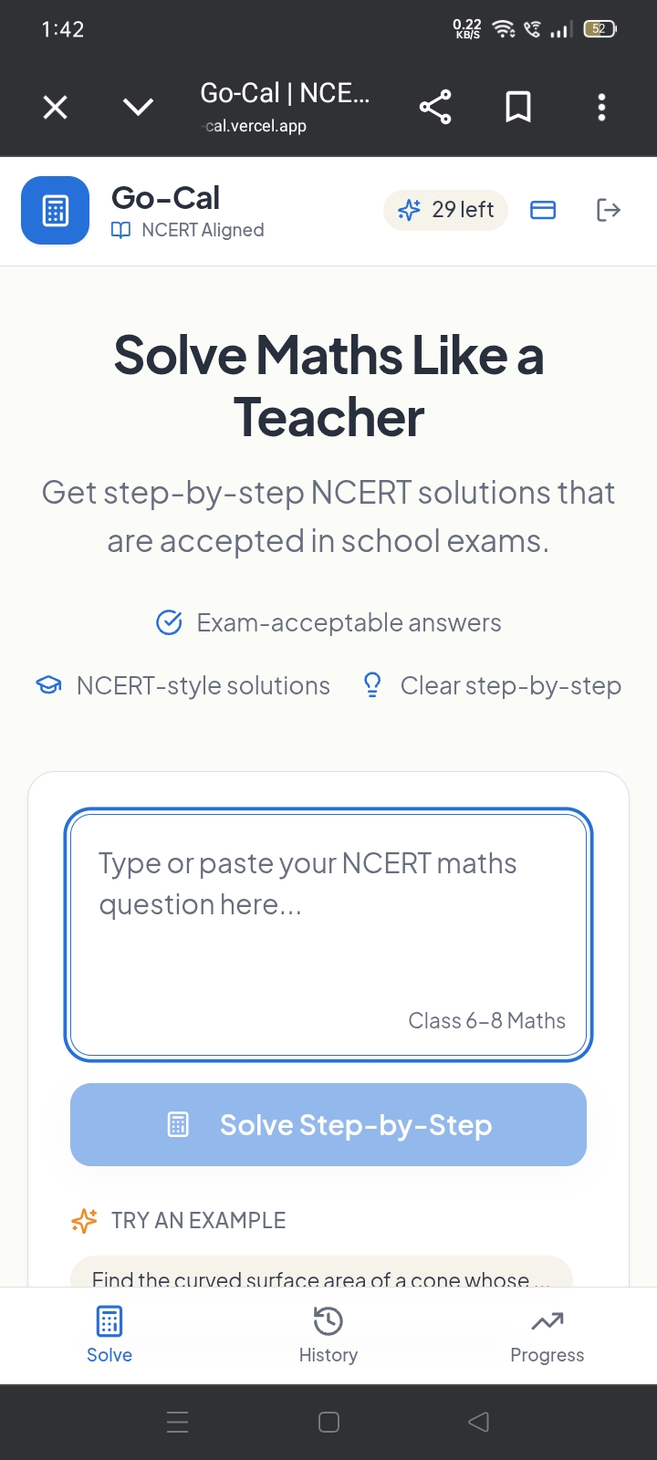 Students spend hours practicing mathematics, yet struggle when a problem is even slightly modified. The issue is not effort, but a lack of true conceptual understanding. Most tools provide final answers, which encourages memorization instead of learning. Go-Cal was inspired by a simple question: What if solving a problem also meant understanding how to think through it? What it does Go-Cal is a web-based learning tool that transforms any math problem into a clear, structured, step-by-step explanation. Instead of giving only the final answer, it: Breaks problems into logical steps Explains the reasoning behind each step Focuses on NCERT-level clarity Helps students build independent problem-solving skills For example, solving a quadratic equation: Go-Cal guides the student through the process using the quadratic formula: with clear explanation at each stage.