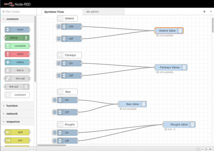 Define Watering of Tees , Fairways , greens, roughs. Roughs are natural with irrigation. Set and sychronize a watering plan thru a Control Interface that open and closes valves by an electro charge.