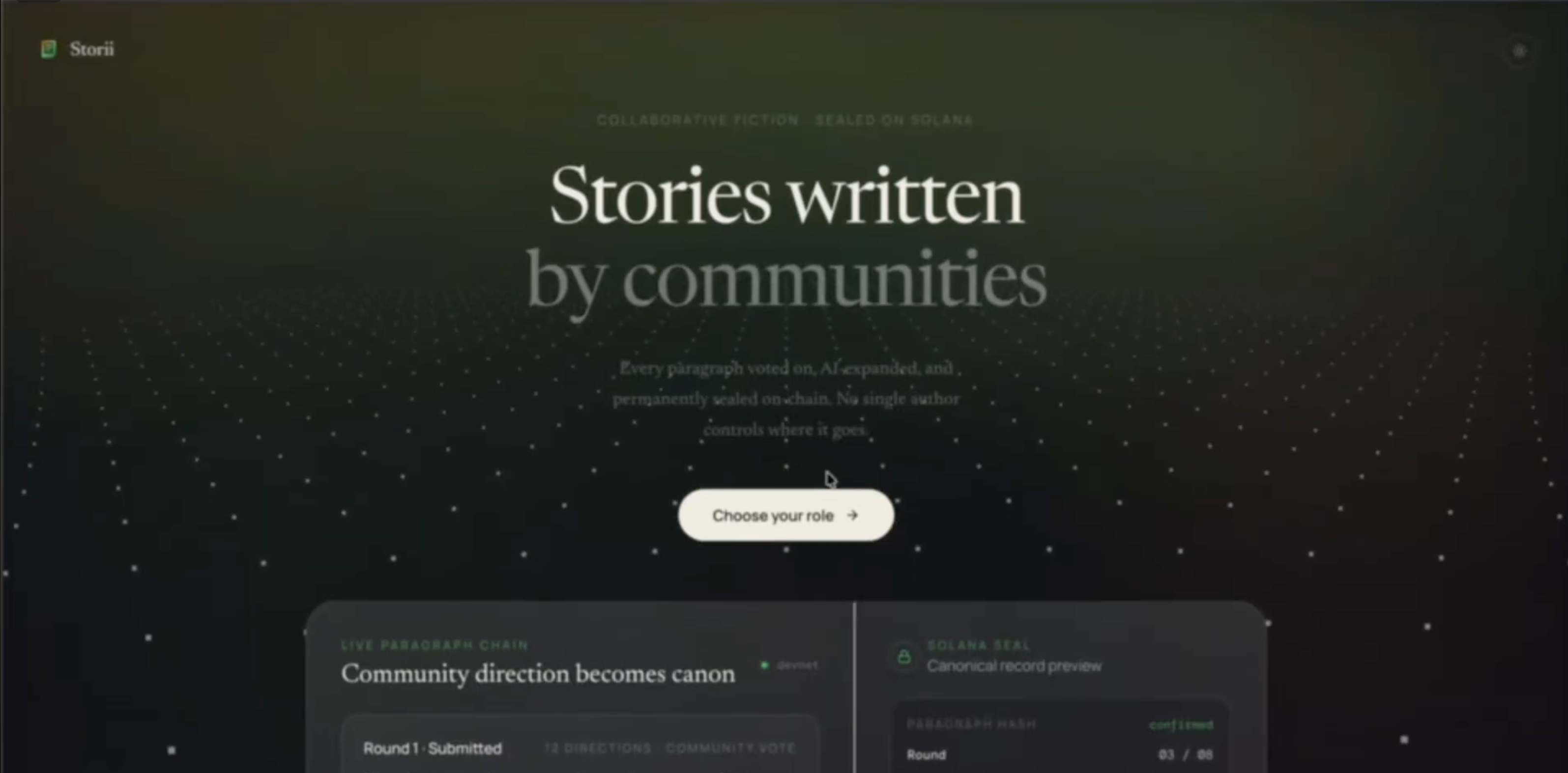 Storii is a collaborative writing platform where creators and their privileged subscribers co-author content paragraph by paragraph, with every vote and winning contribution permanently sealed on Solana.