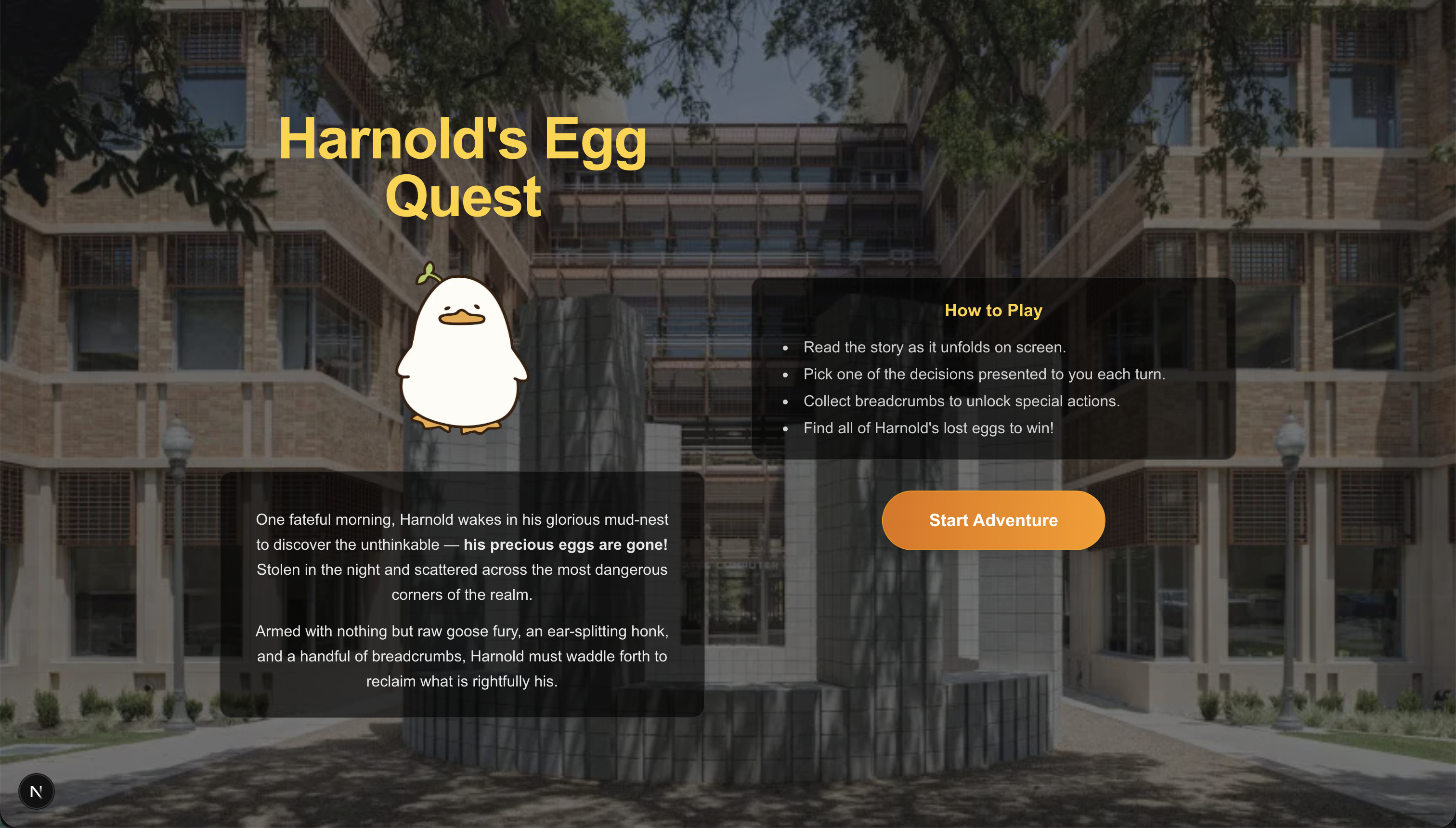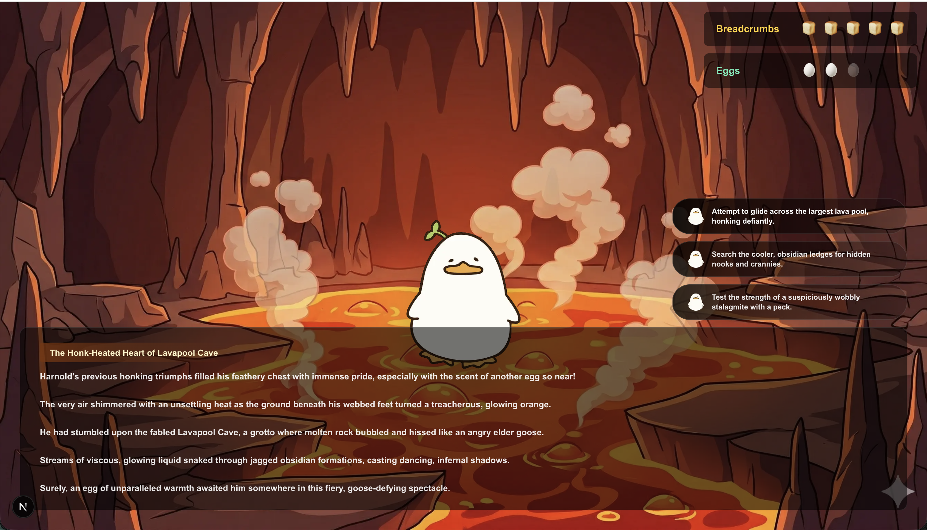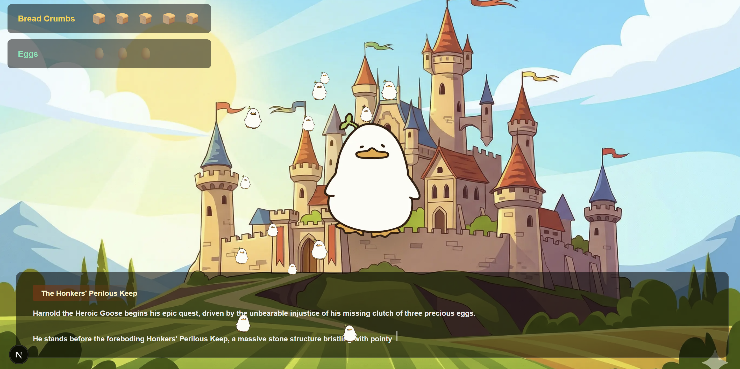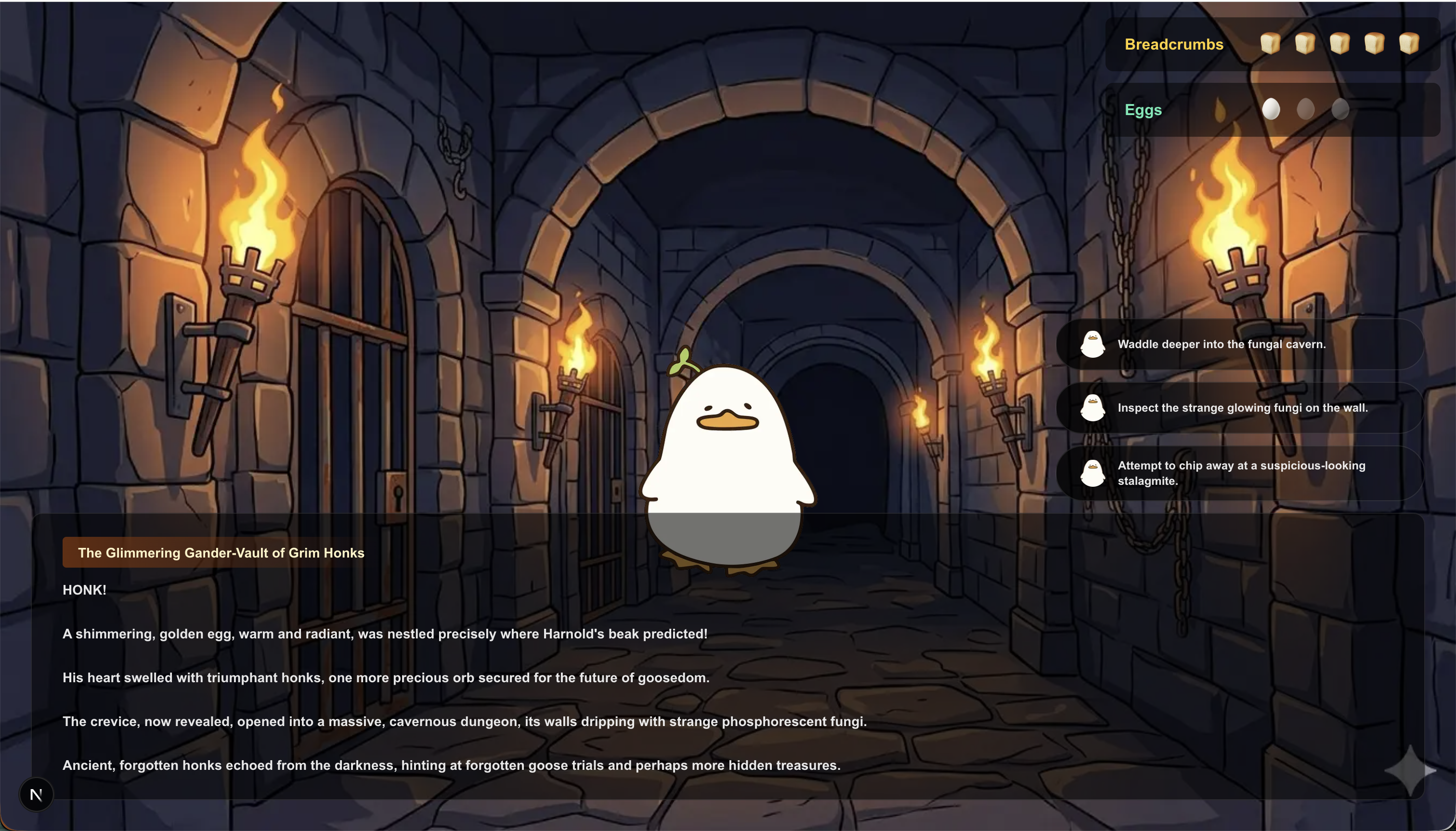 We wanted to push beyond standard "choose your own adventure" text wrappers. Our goal was to leverage the reasoning and story-generation capabilities of modern LLMs to build a fully dynamic, infinitely replayable RPG with a twist: a deeply unserious, hyperactive goose Game Master.
