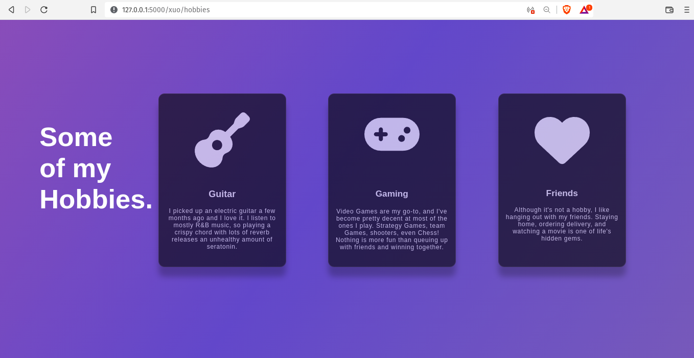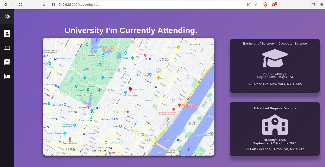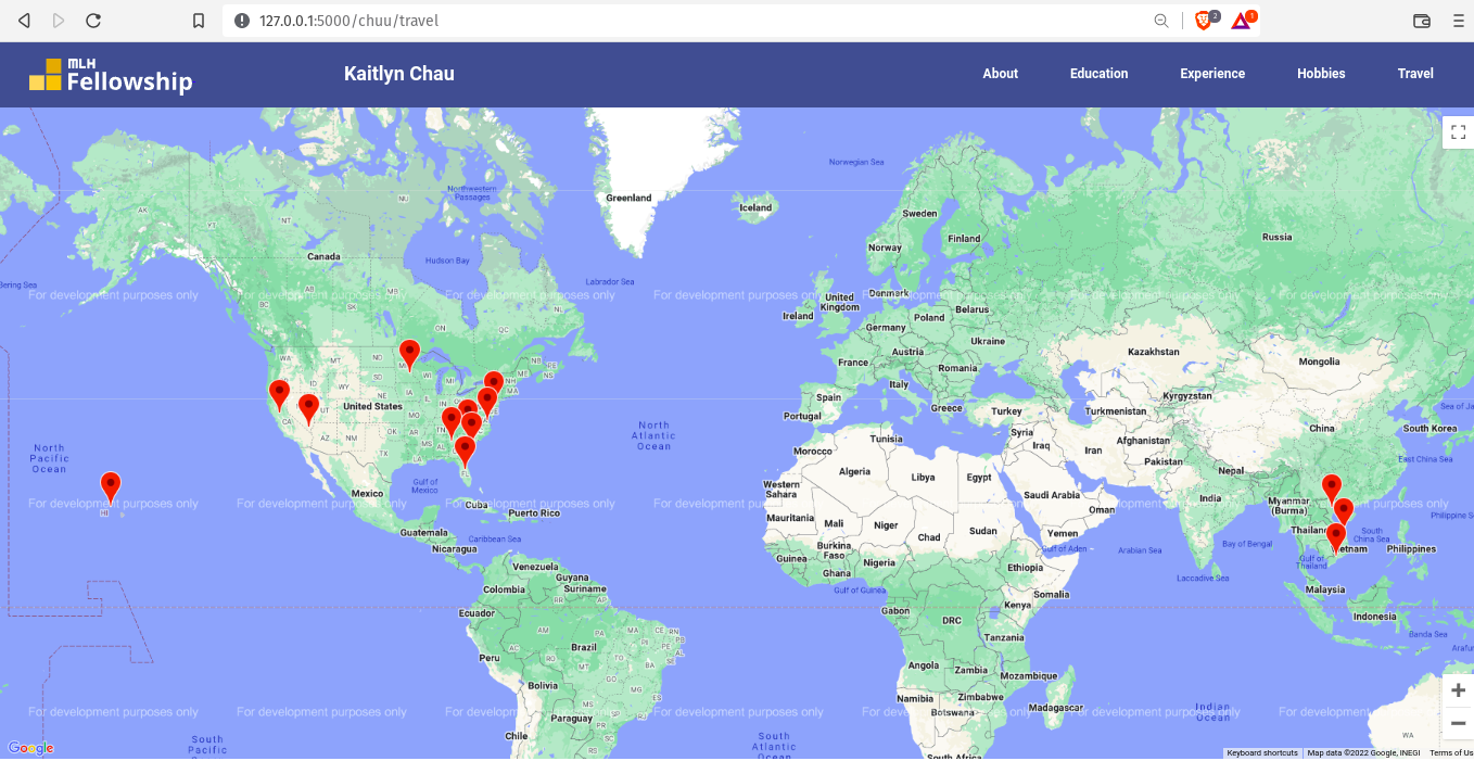 -Familiarize with basic Flask rapidly. -Using Jinja template for NavBar. -Using Google Maps API. -Extra work: second website tab (Set's effort). -Slideshow on Hobbies section.