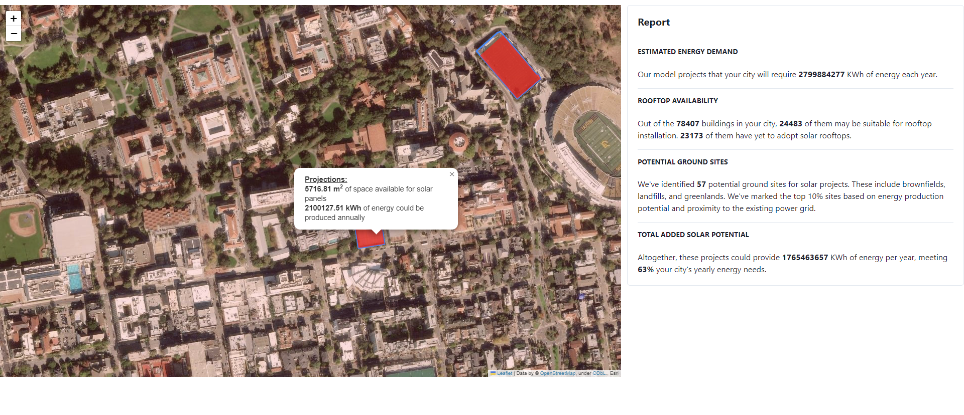 GoSolar uses advanced satellite imagery and image classification models to identify the best locations to place solar panels. After identifying potential areas such as landfills, greenfields, brownfields, and parking lots, GoSolar determines which areas are most feasible to integrate into existing power grids through proximity. GoSolar also provides statistics such as estimated energy demand, number of potential roof locations, number of potential ground site locations, and solar potential.