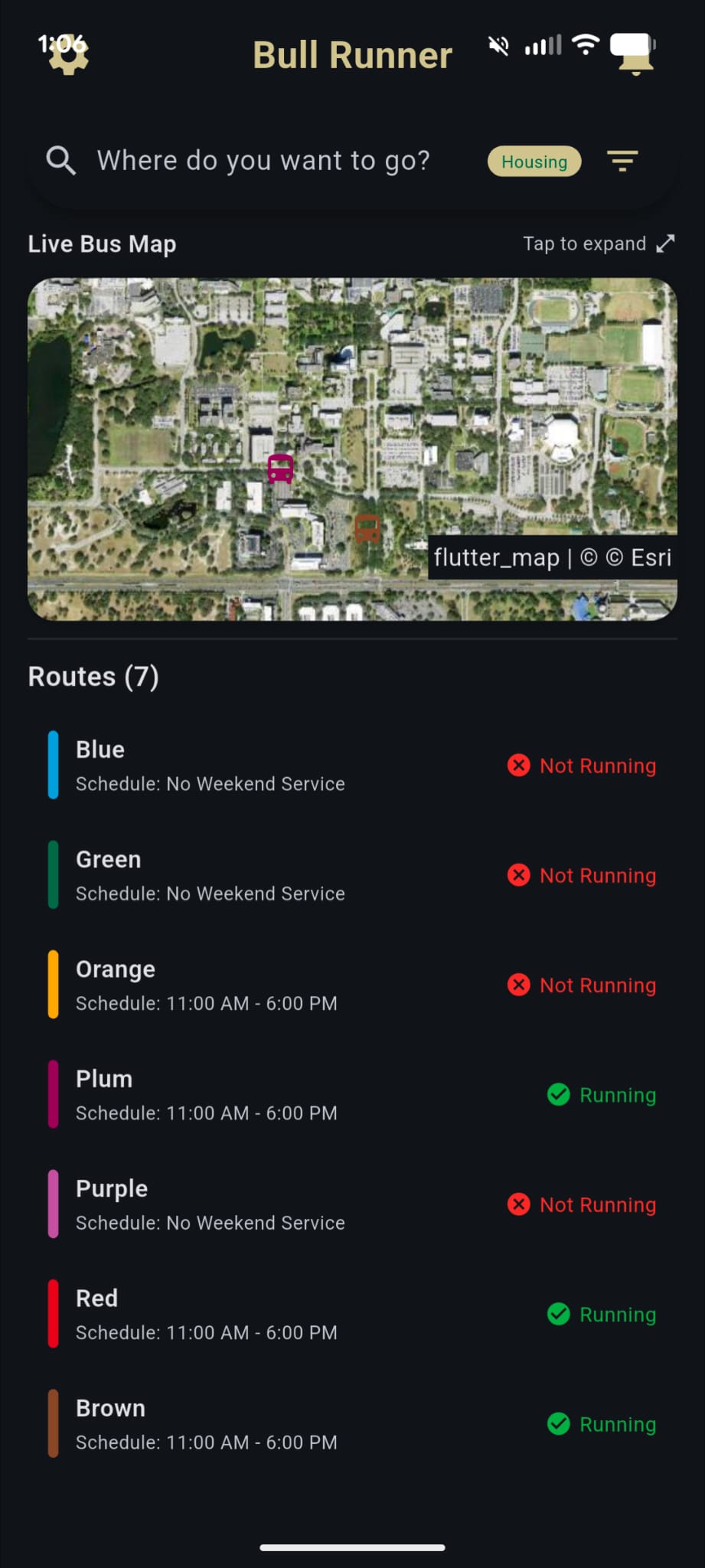 Our application is a version of the USF Bull Runner system that we redesigned and focused on improving accuracy, navigation, and overall user-friendliness. It allows users to view real-time bus locations, search for a campus building, and decide the most efficient routes to arrive at their destination. The application helps users make faster decisions by showing a precise approach to buses, reducing uncertainty and waiting times when moving across campus with the live locations.