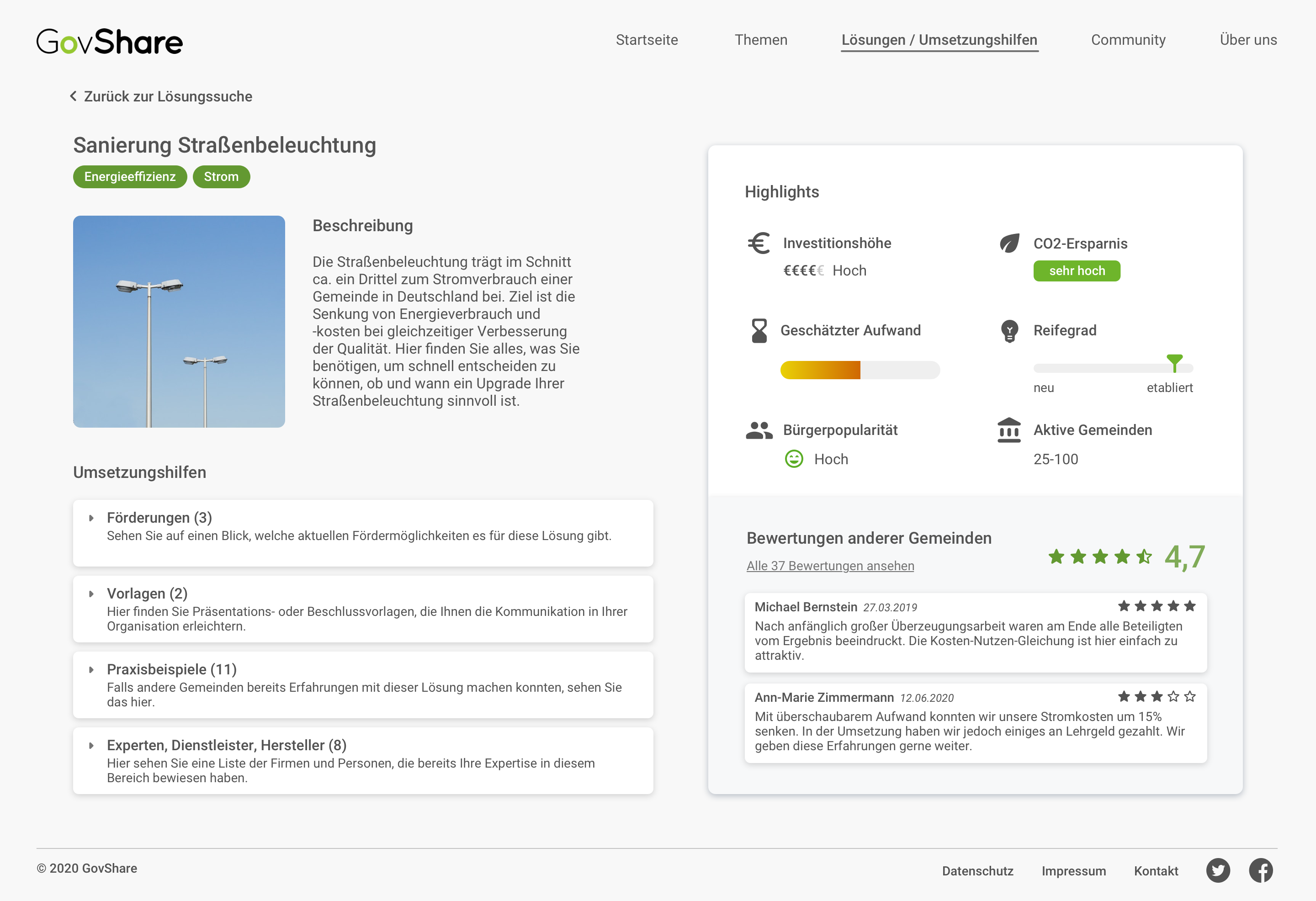 2) Sollten Energie- oder Klimaschutzmanager:innen zu einer Lösung mehr wissen wollen, werden sie mit konkreten Umsetzungshilfen wie einer Übersicht zu Fördermöglichkeiten, Praxisbeispielen und Beschlussvorlagen ausgestattet (Abbildung 2). So ist man verwaltungsintern sofort auskunftsfähig und sieht zusätzlich auch noch eine Liste von Dienstleistern und Experten, die andernorts bereits ähnliche Lösungen umgesetzt haben.