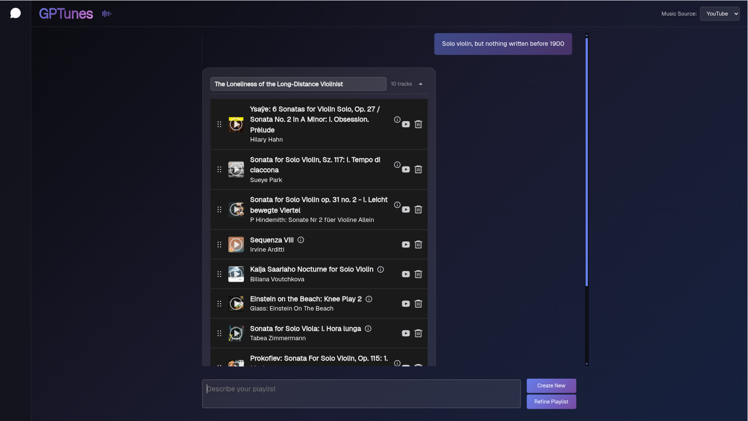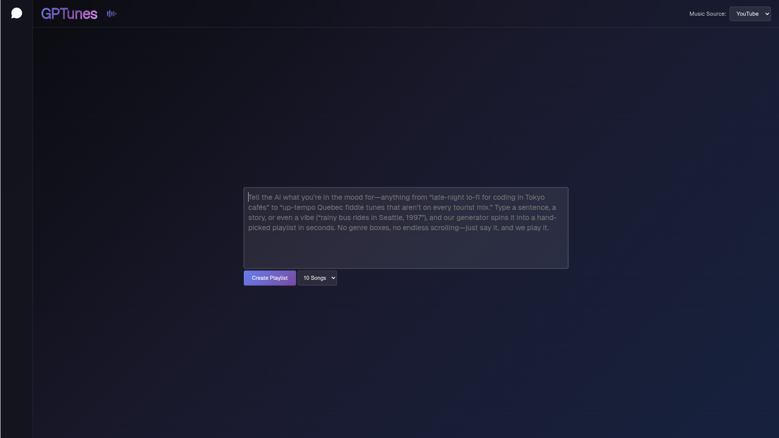 Describe the music you want to find -- could be a vibe ("rainy day at the beach"), a sub-genre ("disco polka"), or a set of requirements ("acoustic indie songs with my name in them"). GPTunes will find music that fits what you want, and builds you a playlist that you can listen to immediately.