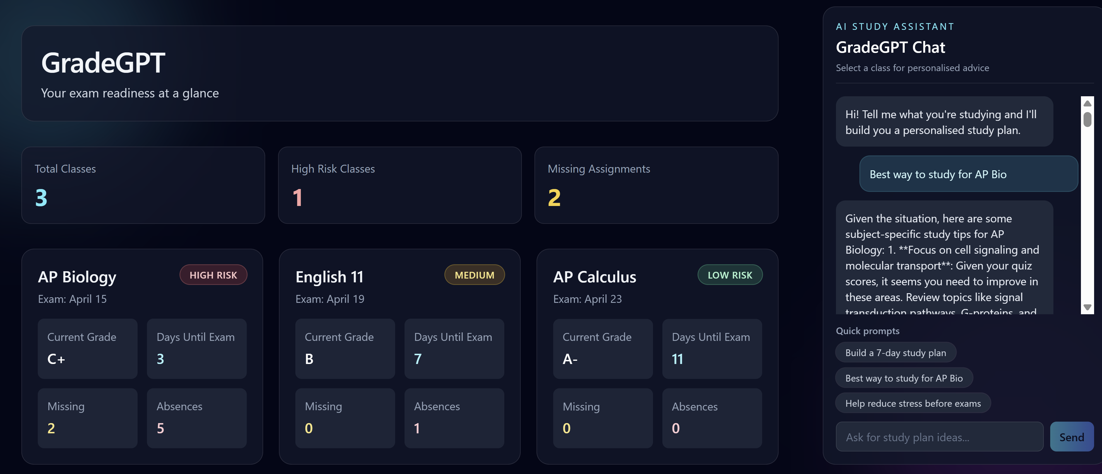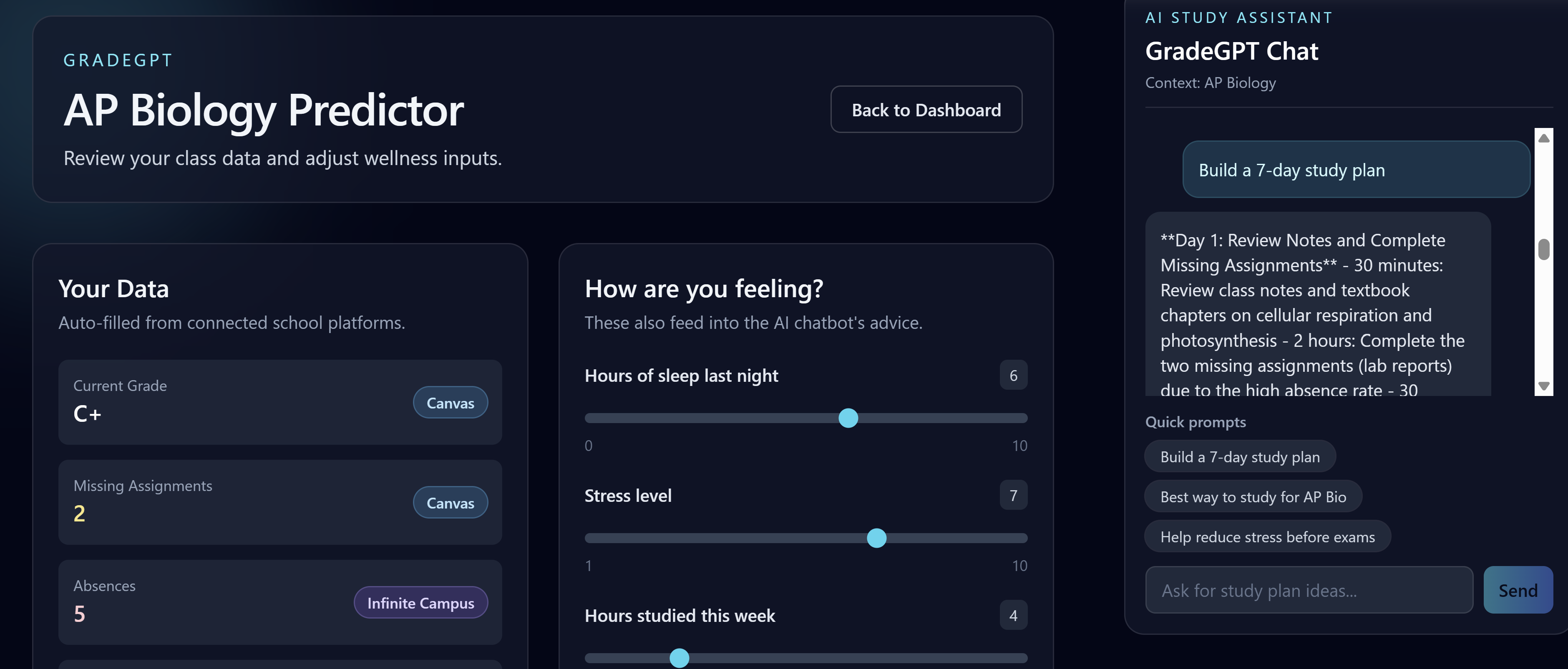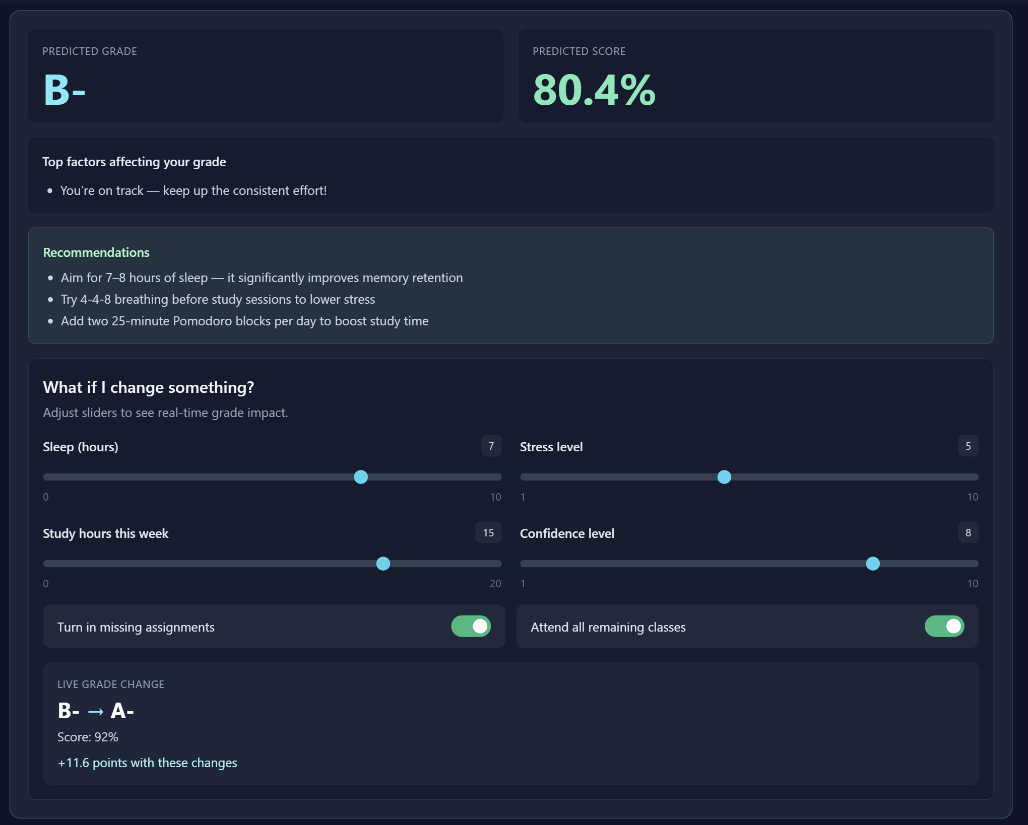 To build the front end, we primarily used HTML, CSS, and React. For the back end, we used Node.js and Express. Our grade prediction logic is based on custom functions that take in student data as input and determine how changes in different factors would affect the grade. For the AI Chatbot, we used Llama 3.1 8B through the Groq API to combine the student data with their prompt to return personalized responses. We used Railway to publish our app online.