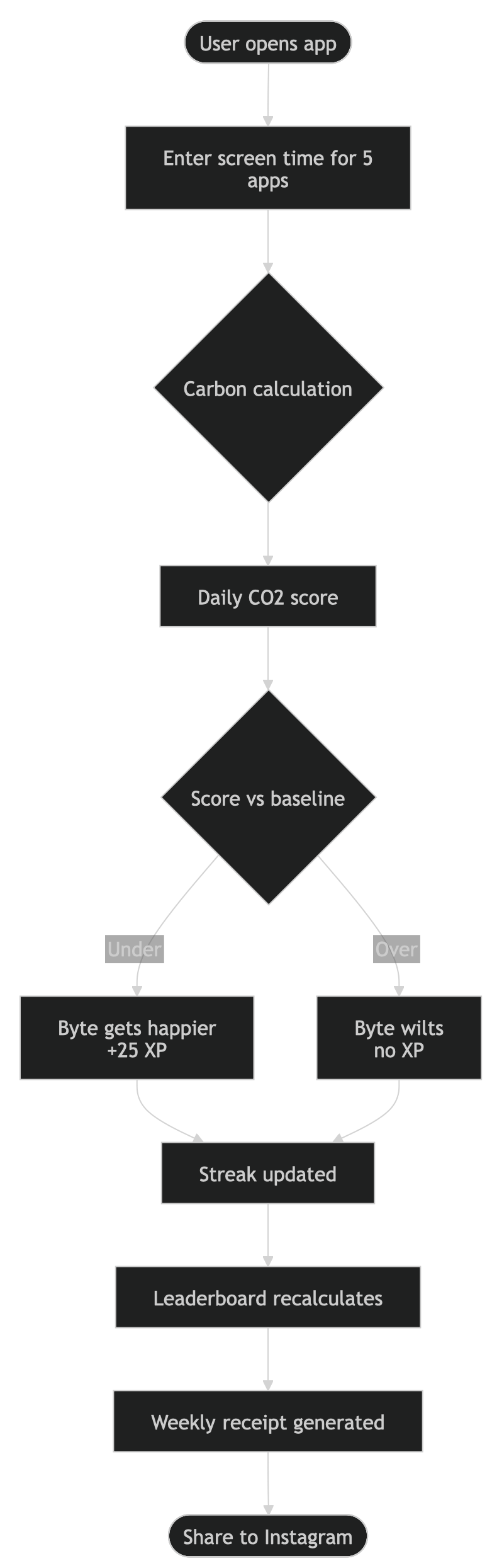 3. A weekly carbon receipt We designed a shareable weekly summary card that works like a “Wrapped”-style receipt for digital emissions. It highlights total carbon output, top contributing apps, baseline comparison, and user progress. This feature makes the experience social, visual, and inherently shareable.