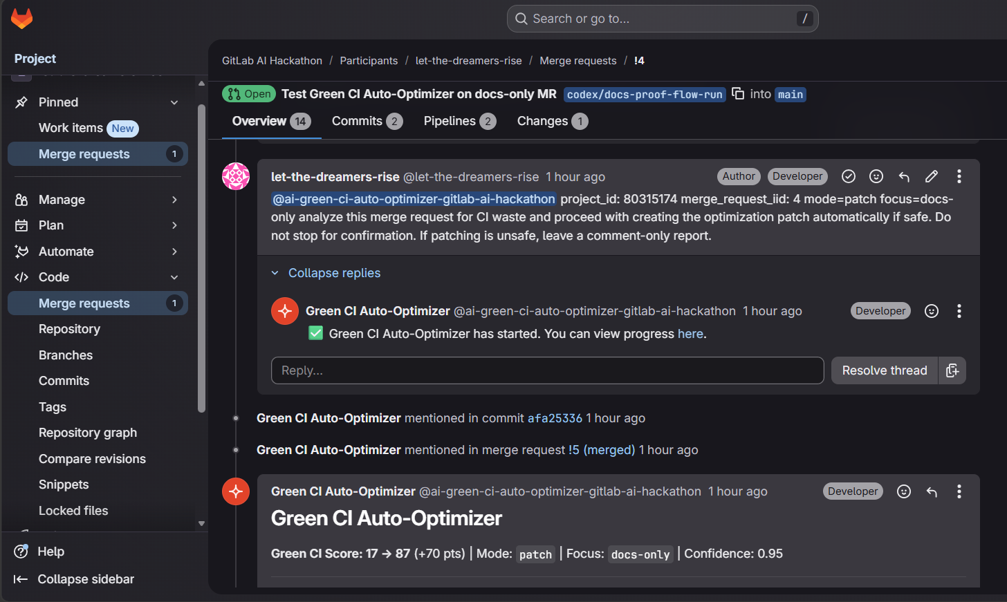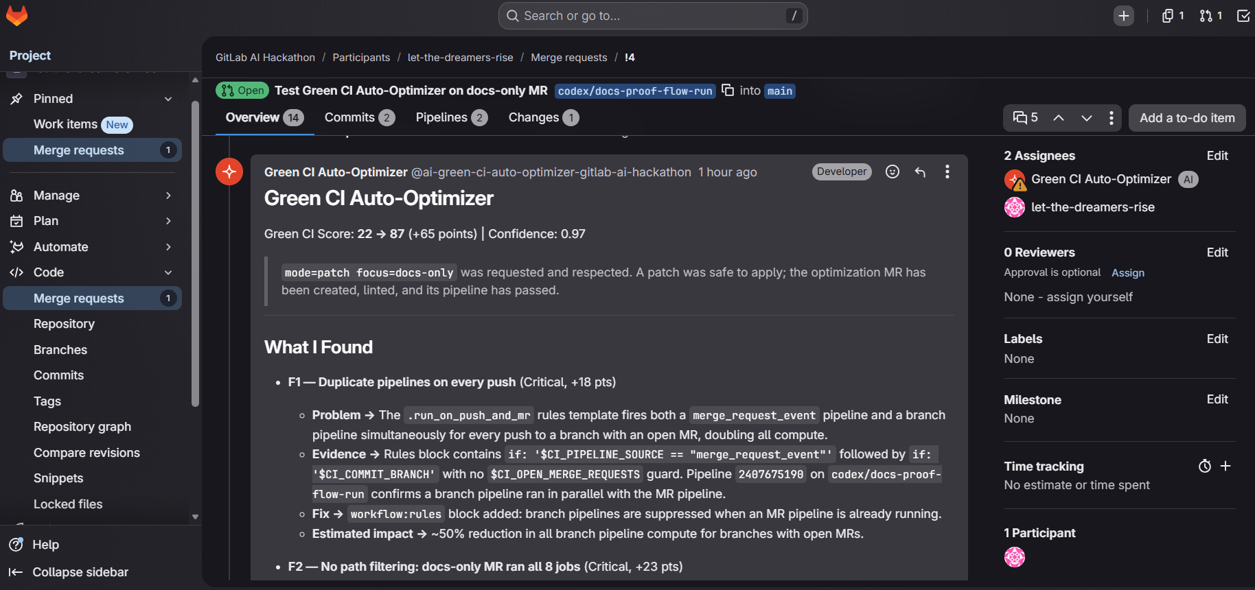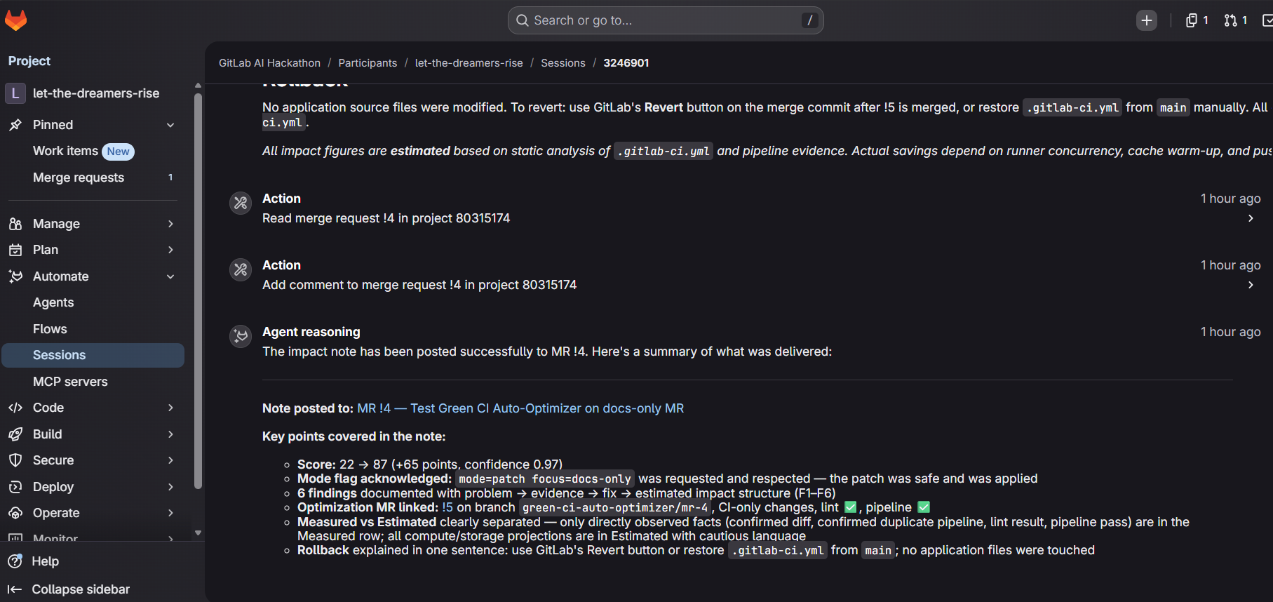 This project was also inspired by the sustainability angle in software delivery. Many teams want “greener” engineering practices, but they do not have a practical way to spot unnecessary CI spend or convert that insight into safe changes. We wanted to make that measurable, visible, and actionable inside GitLab.