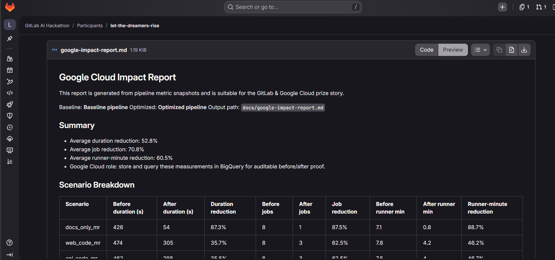 For measurable impact, we added a Google Cloud BigQuery layer that stores pipeline metric snapshots and generates an impact report. This makes the GitLab + Google story meaningful rather than decorative: GitLab Duo performs the workflow automation, and Google Cloud provides durable measurement and reporting.