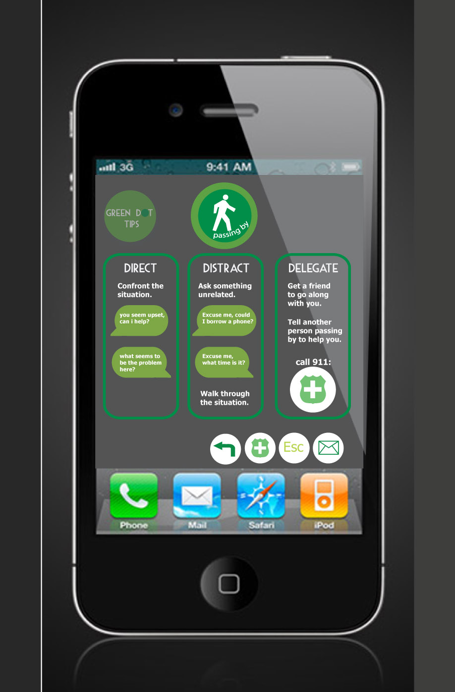 University of Kentucky (UK) Green Dot App The UK Green Dot App Against Abuse is one campus' effort to empower active bystanders. The University of Kentucky is proud to be home of the Green Dot, developed by the Violence Intervention and Prevention (VIP) Center. A Green Dot is a single moment in time when a bystander chooses to promote safety and complete intolerance of violence by using words, behaviors, choices or attitudes. The Green Dot active bystander training brings students together to understand violence and abuse, find their connection to the issue, learn about active bystander intervention and prevention, overcome barriers and challenges to active bystander intervention, and practice active bystander skills. The UK Green Dot App joins users, especially students who have received Green Dot active bystander training, to download the app, seek support from each other, continue to receive education on violence and abuse prevention, find campus and community resources, be connected to a strong network of trained active bystanders, and encourage their friends to get involved! The UK Green Dot App committee has developed the app prototype in a series of steps. Committee members include the University of Kentucky Center for Research on Violence Against Women, Public Relations, Violence Intervention and Prevention Center. Ex-officio membership and input was sought from the Kentucky Association of Sexual Assault Programs, University of Kentucky Student Affairs technology staff, and Verizon Wireless. We wanted to ensure we developed a mobile web application (app) that would empower UK students to prevent dating violence and sexual assault with active bystander intervention tips, access to resources, real-time connections to friends and supportive allies, integrated social media, and safety/privacy features. First, we began with discussion about how to reach UK community members through a useful, innovative and effective app. Next, we gathered background information on how apps are used by UK community members. Committee members explored other apps and examined literature on app usage and marketing. We conducted a focus group with student representatives to get feedback on how an app would be used and how it could be promoted. Again, we strived to develop an app that would be user-friendly, safe, creative, interactive, impactful, resourceful, and integrated with other social media tools. Finally, we designed an app prototype based on what we learned: University of Kentucky Green Dot App