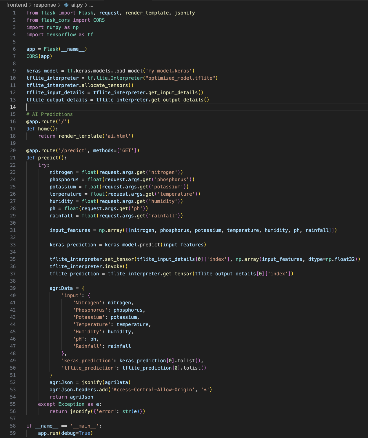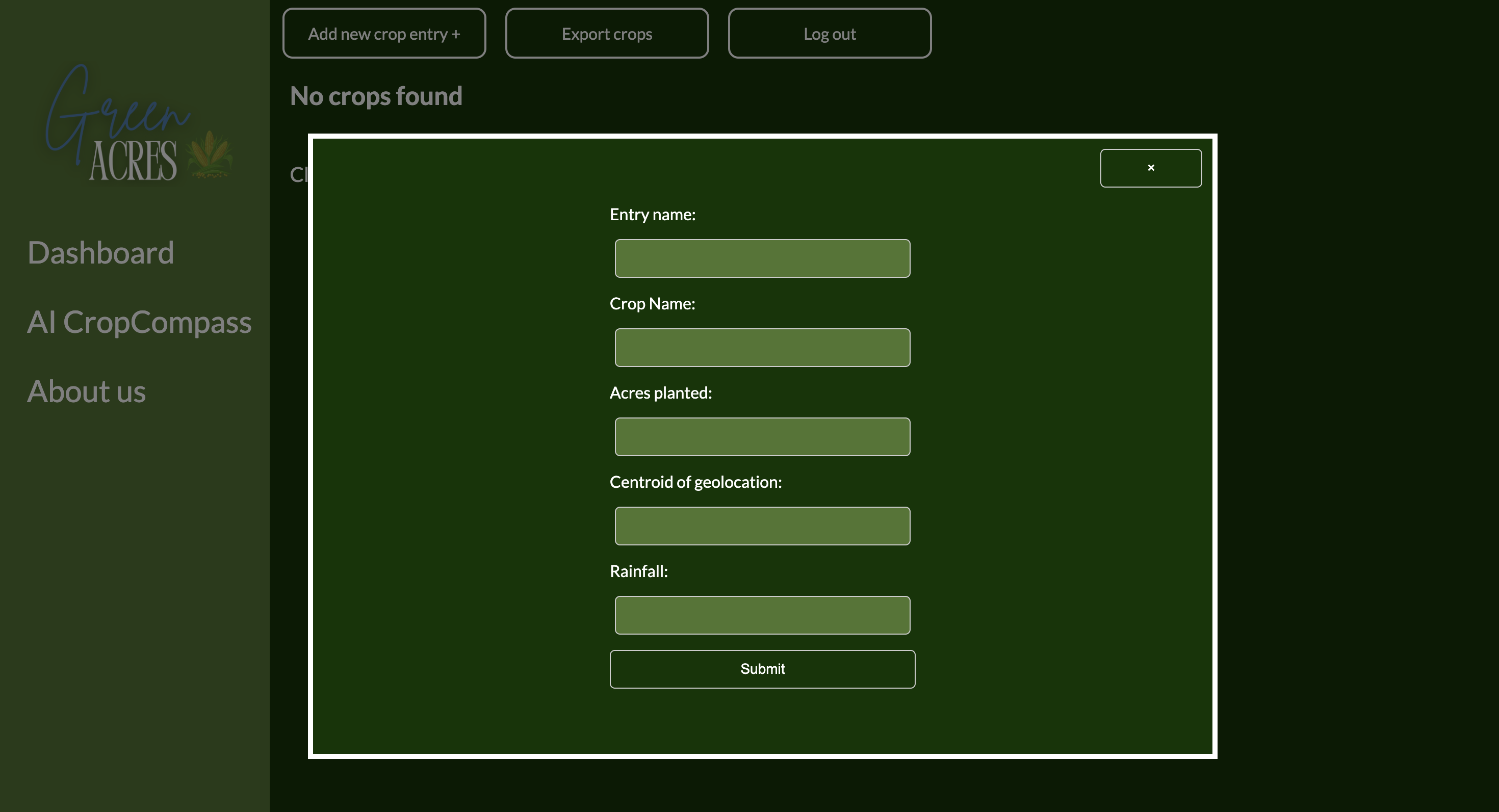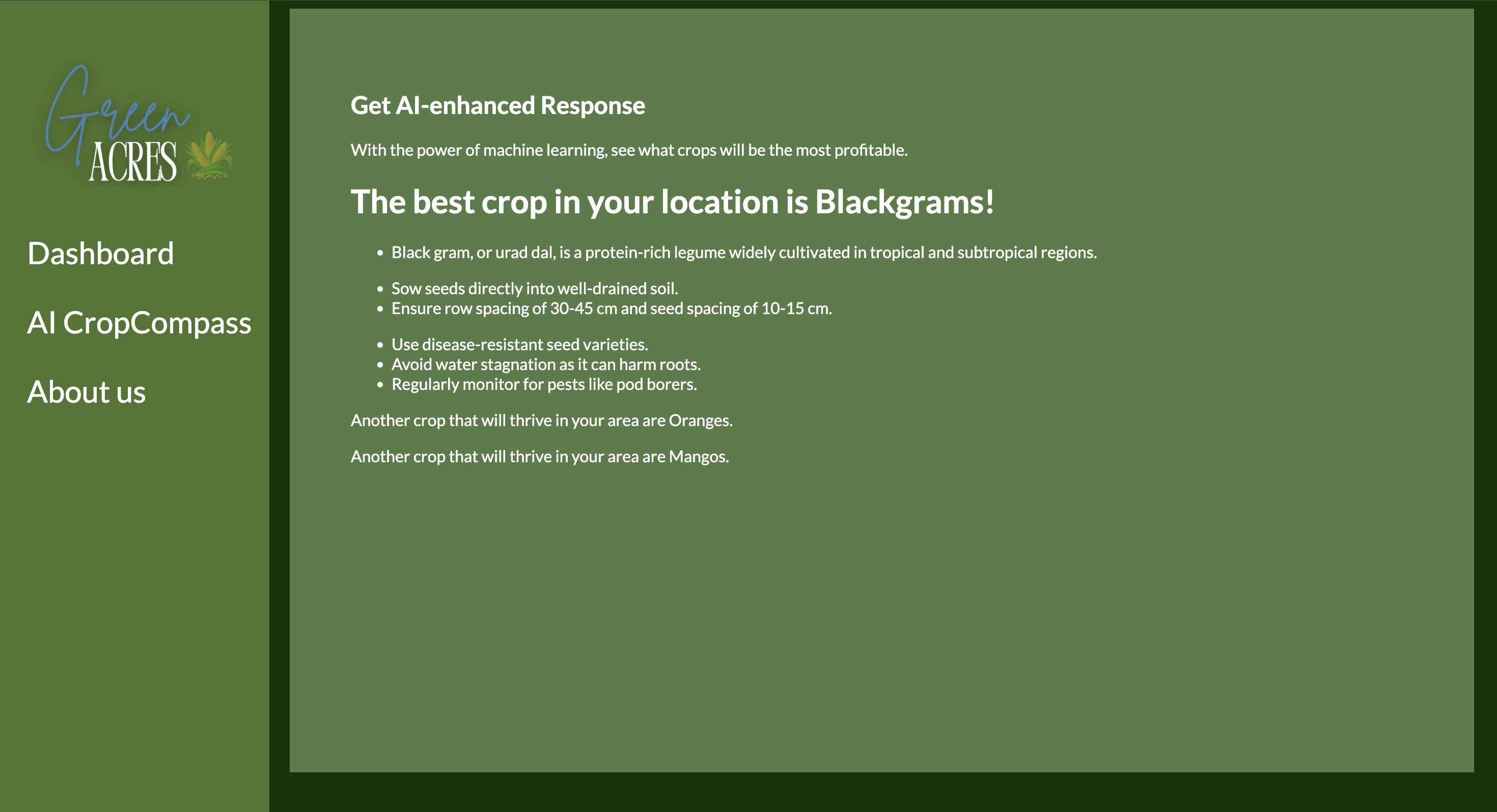 At its core, it provides 2 main services: a user-friendly crop management software and the AI CropCompass. The management software allows for farmers to store their crops and additionally, get recommendations on how to nurture their crops. But the pièce de résistance is the AI CropCompass! Using the RandomForestClassifier training method, we trained an AI model to predict the best crop given one's location. Choose your location on the given map, or input your coordinates, and our software calls multiple APIs to get specific data about the location, such as the soil quality, the weather in the area, and more. We then plug the data into our TFLite AI model and get the best crop from a selection of nearly 800 strains of crops.