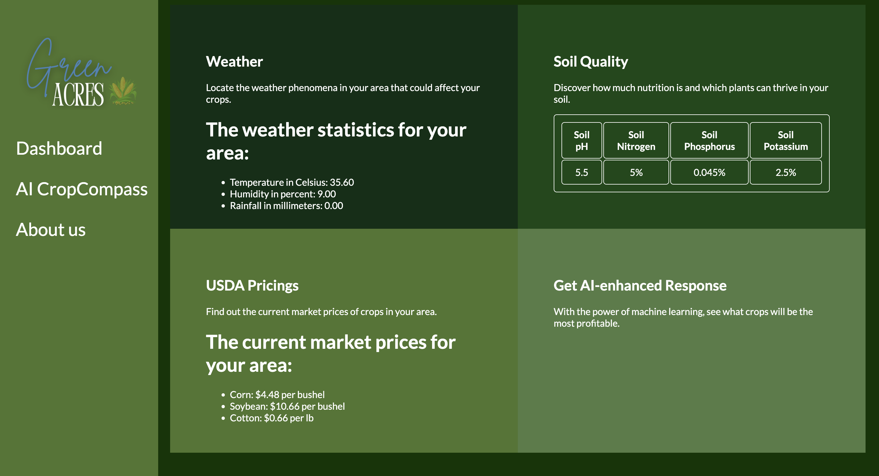 In the next steps, we want to also implement a method of allowing for direct sensor input to the application that allows for more accurate data collection and more. As of now, we are relying on APIs to do this, but with more direct and precise measurements, we can give more power to the farmers that use GreenAcres.