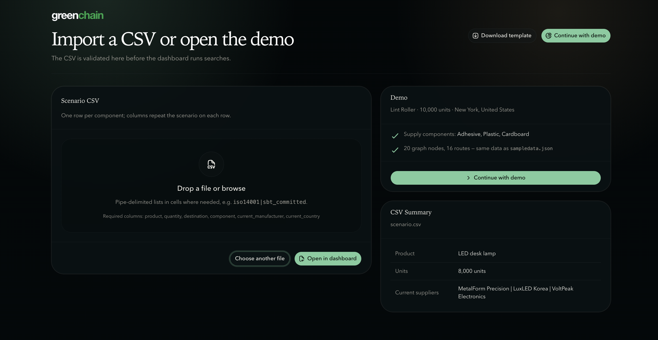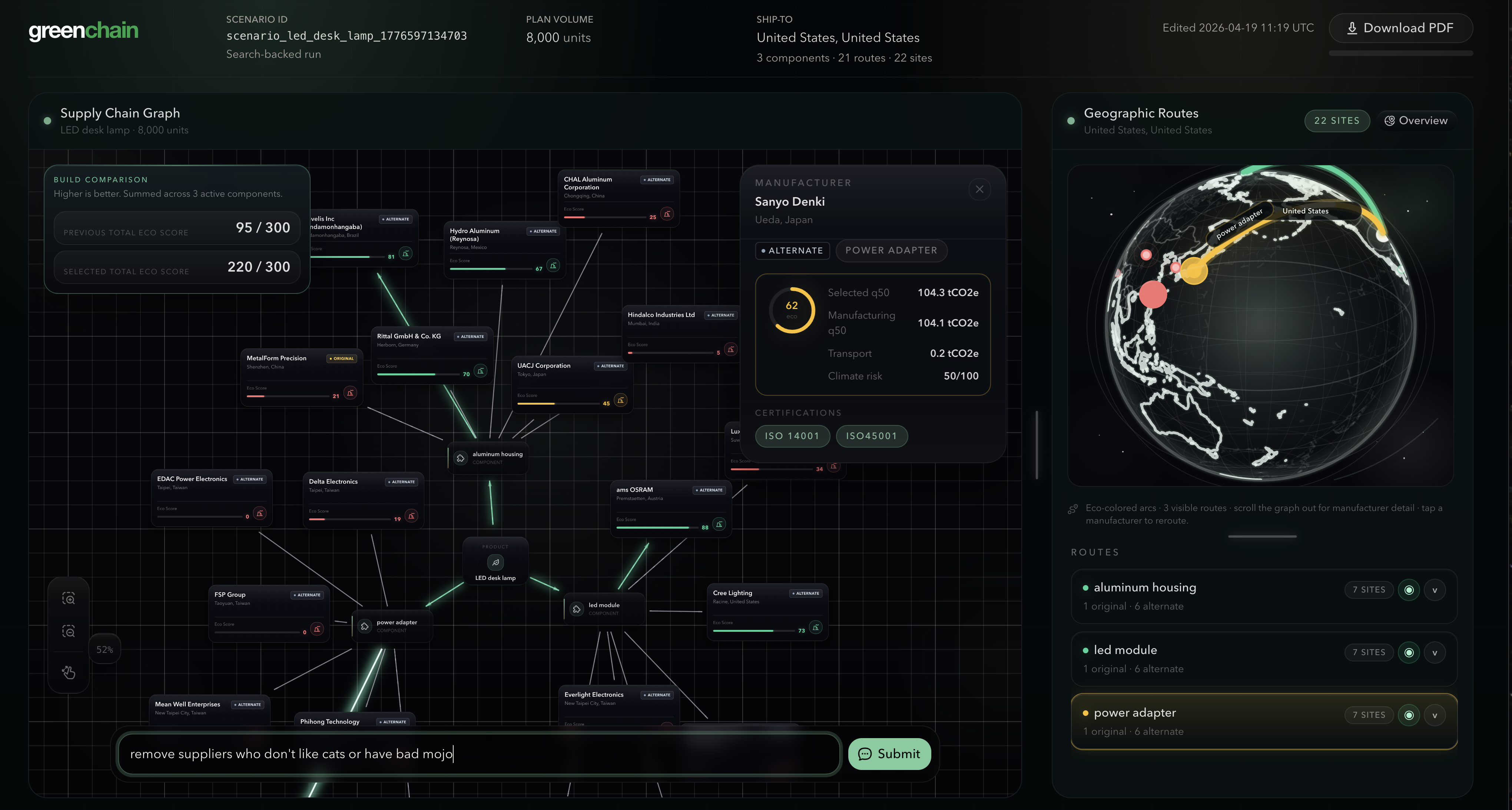 Simply put, GreenChain is an environmental supply chain comparator. You describe what you're sourcing — product, destination market, quantity, candidate countries, and transport mode — and GreenChain automatically discovers real manufacturers for the components, scores them across five environmental dimensions (manufacturing emissions, transport carbon, grid carbon intensity, certifications, and climate risk), and ranks them on a live dashboard. Results render as a force-directed supply chain graph and an interactive 3D globe with animated shipping routes. You can then write plain-English scenario edits to swap suppliers and analyze the data, exporting a full sustainability report — an actionable sourcing decision in a matter of minutes.