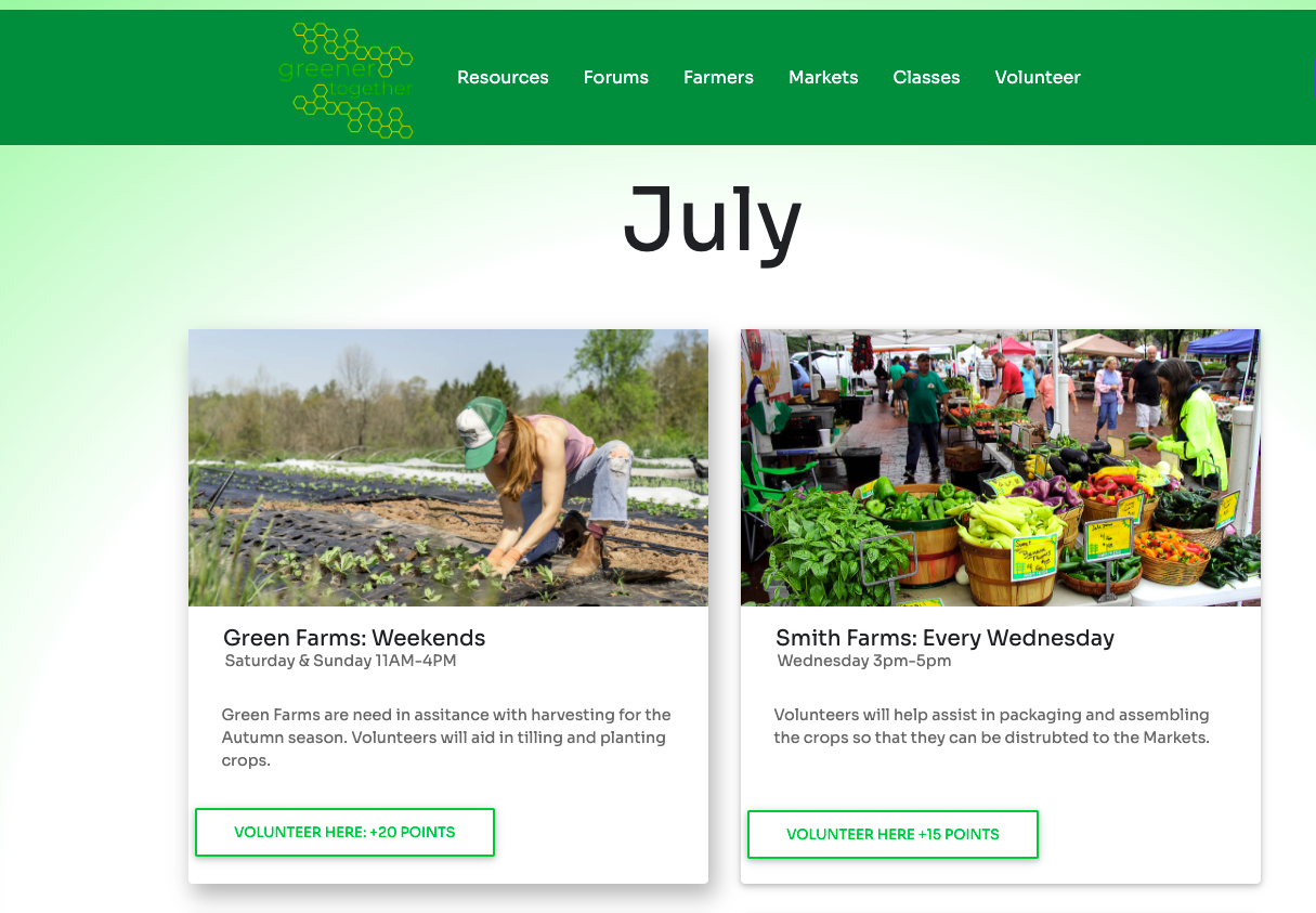 In the future, we plan to Build a back-end and create a strong marketing push to generate users for our site. We also plan to build a mobile application that will have the same functionality as our website. At the same time, we plan to start building a purchase portal & a CSA subscription platform as well as a tab for classes. We feel that it would be essential to host different classes for the community so that they can learn essential skills that could further them as a volunteer, market host, farmer, etc. Users will be able to register and attend these classes which will also tie into the point based system created in the volunteering section.