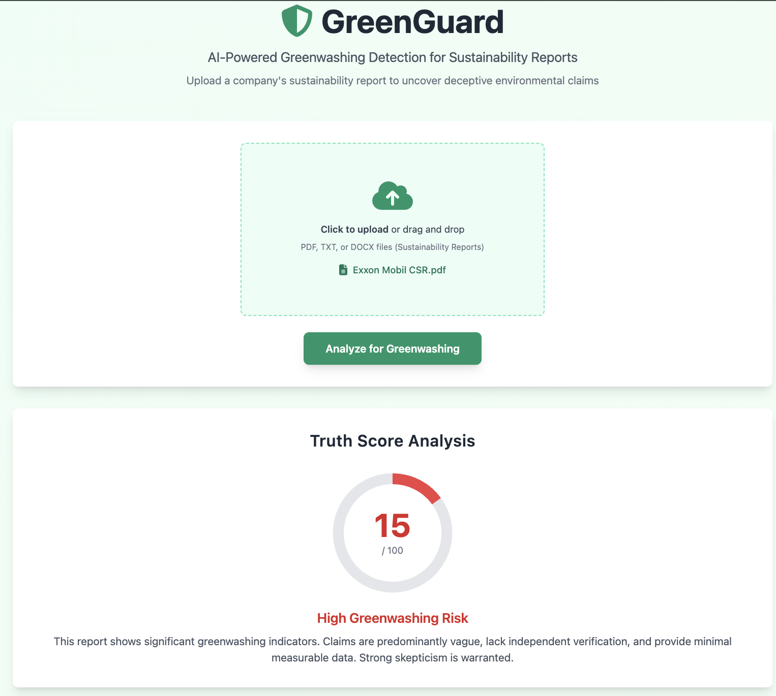 GreenGuard is your shield against corporate greenwashing. The tool protects users from deceptive environmental marketing by detecting patterns that human readers miss. It's like having an environmental health expert and ESG analyst reviewing every corporate sustainability claim on your behalf. Users upload company ESG or sustainability reports (.txt format), and the AI protection system: