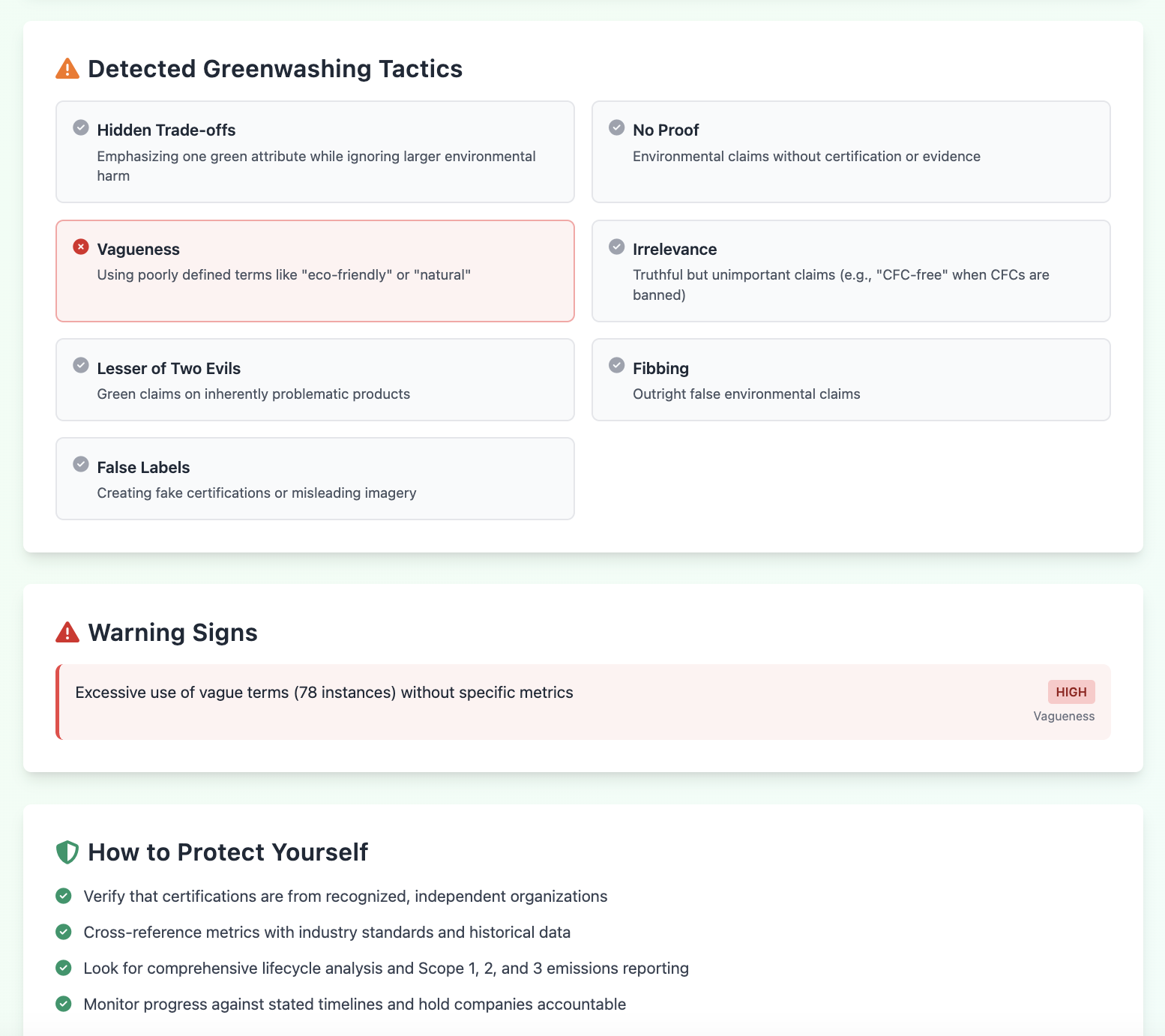 - Detects 7 Greenwashing Sins: Identifies misleading tactics including "Vagueness" (undefined terms like "eco-friendly"), "No Proof" (unverified claims), "Hidden Trade-offs" (cherry-picked metrics), "Fibbing" (false claims), and more