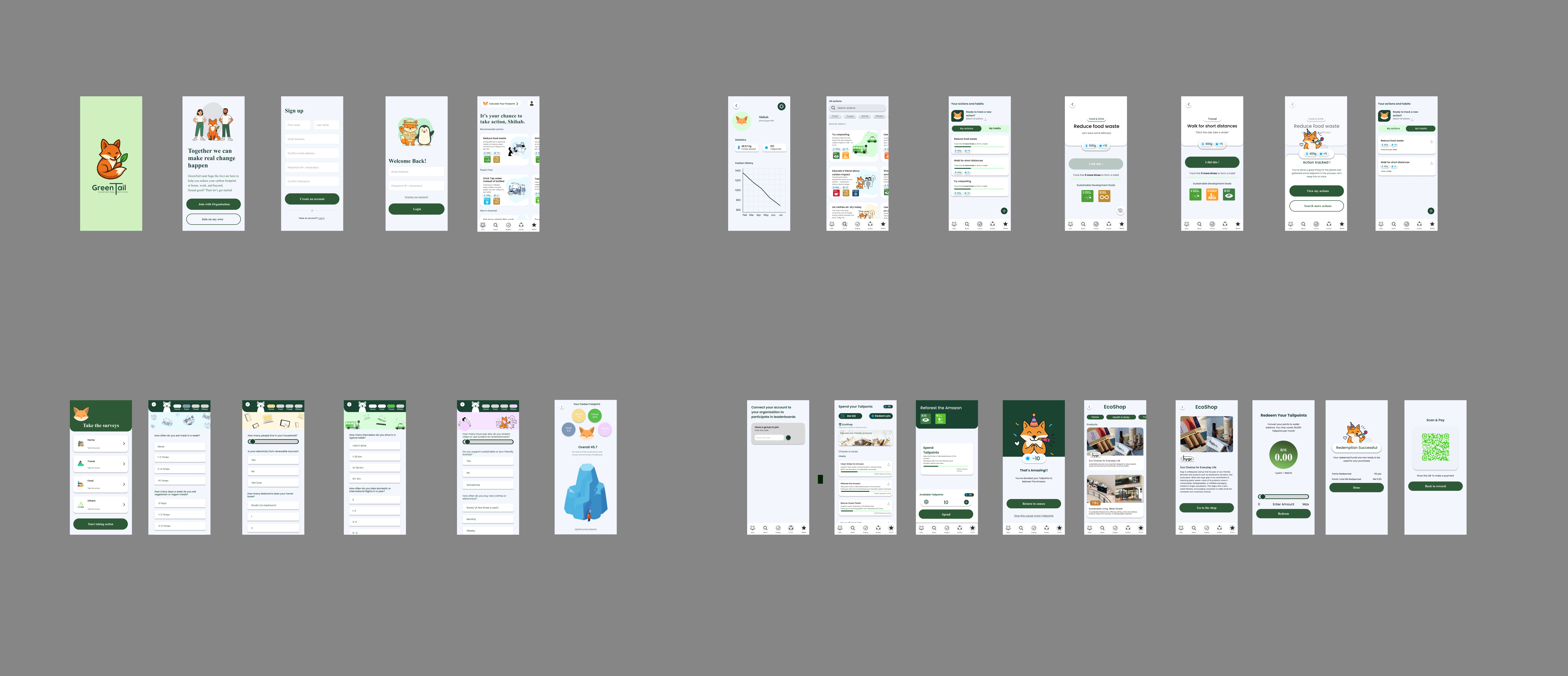 GreenTail is a gamified Android application that helps users calculate their personal carbon footprint based on everyday lifestyle choices. It covers four main areas: food, home energy use, travel, and daily consumption. Beyond calculation, the app encourages users to complete eco-friendly actions and verify them using AI-powered image verification through the device camera. Verified actions earn TailPoints, which users can track over time, redeem for sustainable products or groceries, or donate to environmental charities. Users can also participate in group challenges and build longterm sustainable habits.