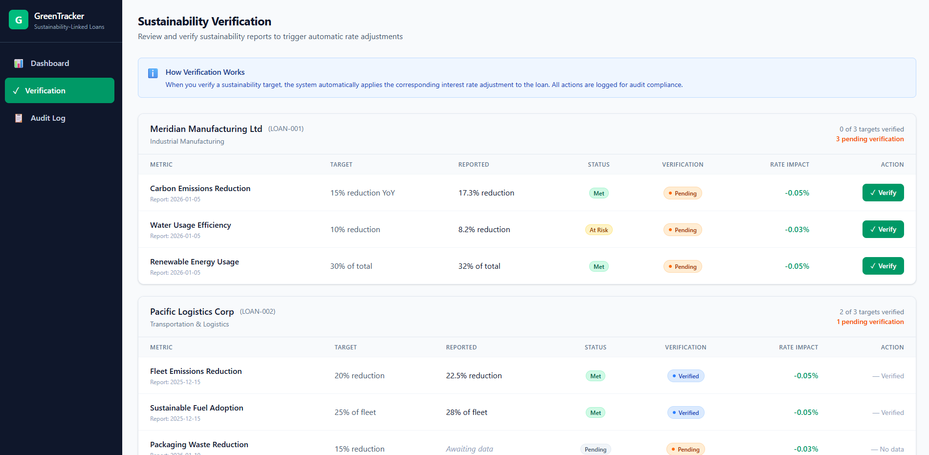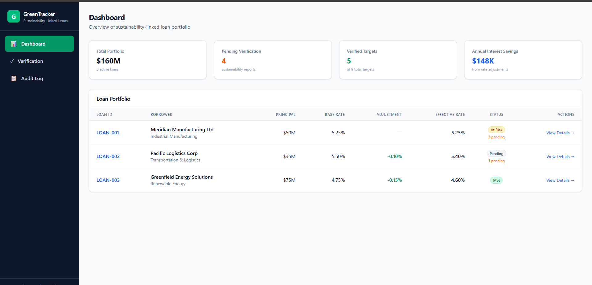 GreenTracker is a desktop-first prototype that demonstrates how verified sustainability outcomes can automatically adjust loan interest rates in a transparent and auditable way.