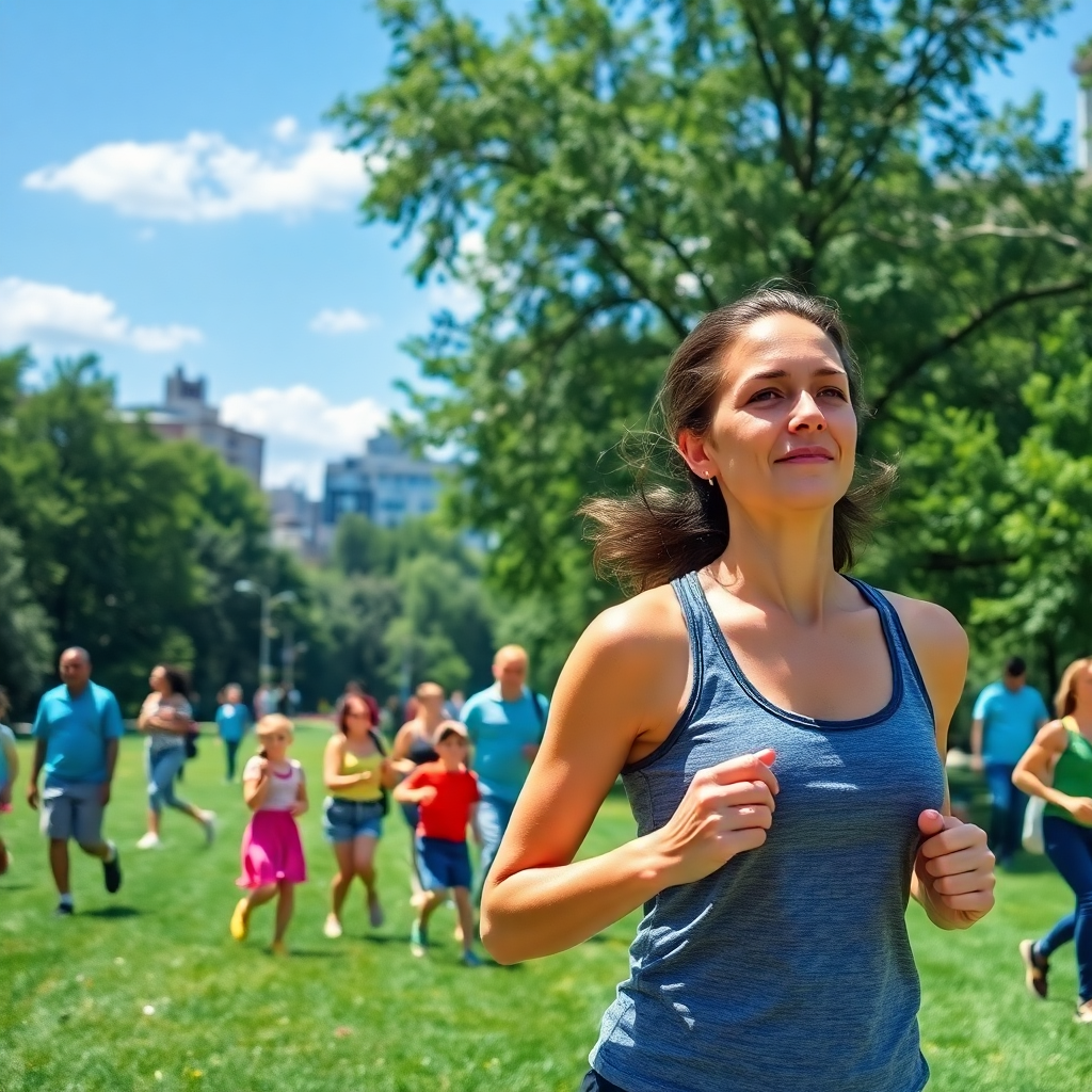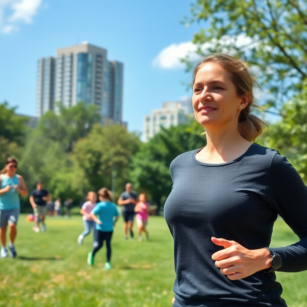 Why I Chose to use the prompt: This prompt highlights the physical health advantages of urban green spaces, focusing on activities that promote fitness and well-being. The jogging woman represents cardiovascular benefits, while children playing frisbee symbolize the fun, social aspect of exercise. By including diverse age groups, it demonstrates that urban parks cater to everyone, reinforcing the universality of health benefits from green spaces. The imagery of clear skies and fresh greenery serves as metaphors for better air quality and overall improved urban health.