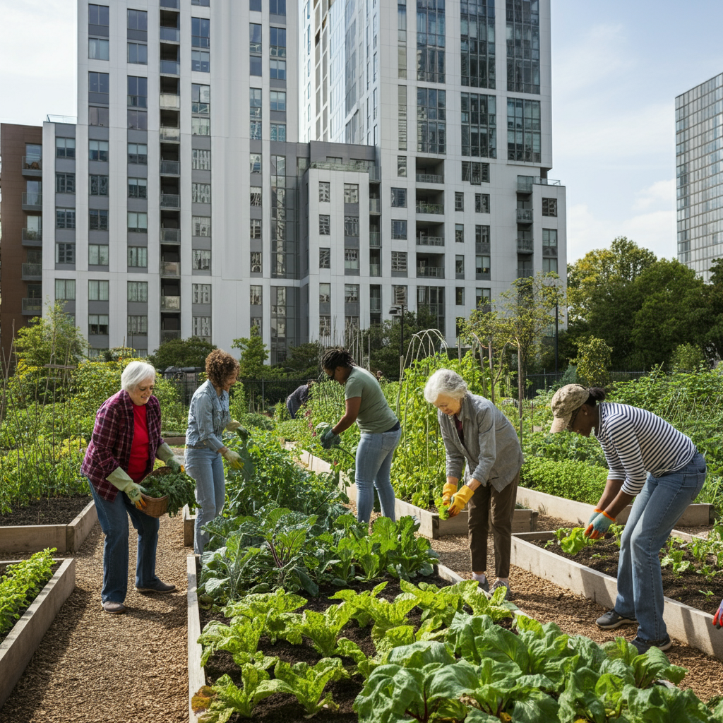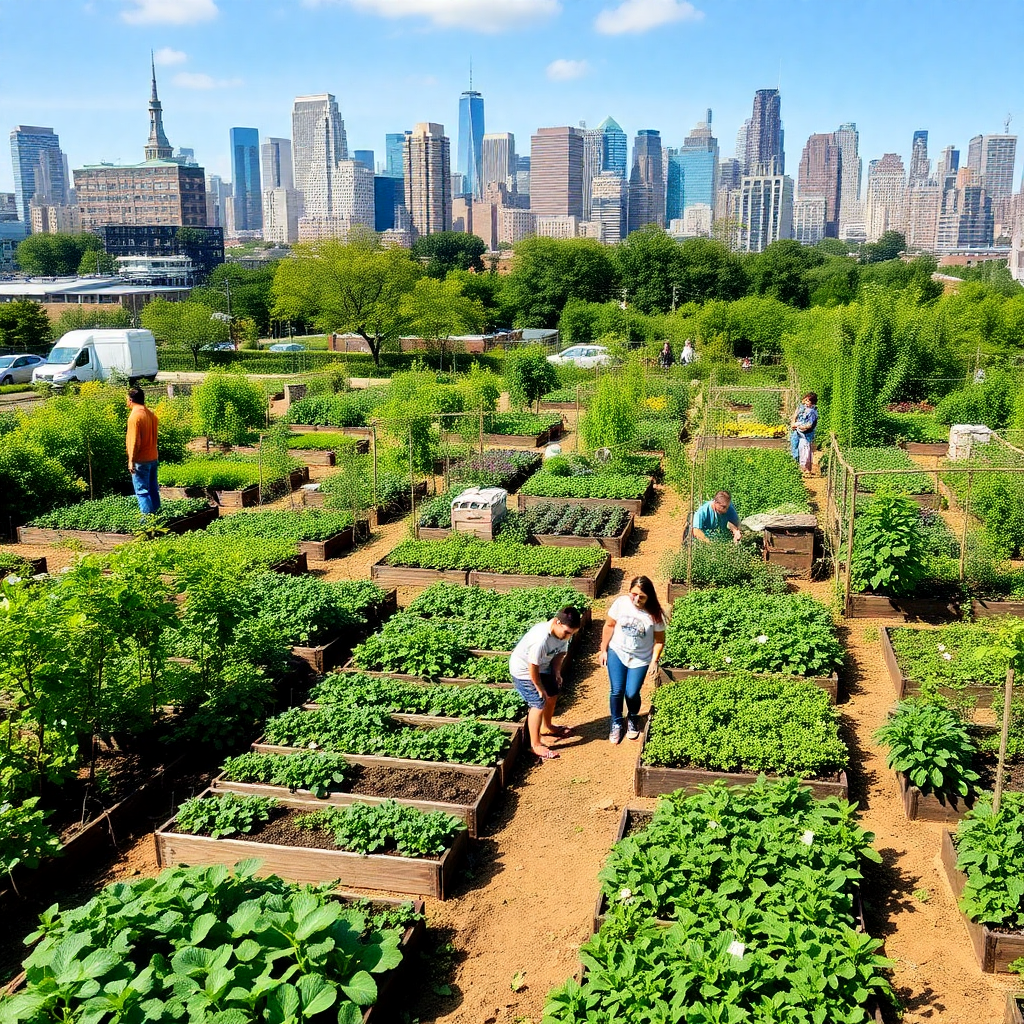 Prompt: "An expansive community garden thriving in the heart of a bustling metropolis. Rows of vegetable beds, fruit trees, and pollinator-friendly flowers create a vibrant, biodiverse ecosystem. In the foreground, a family works together, tending to their plot, while in the background, the city skyline serves as a backdrop, showcasing the coexistence of nature and urban infrastructure." Result of this Prompt is image ( Urban green pic 3.png)