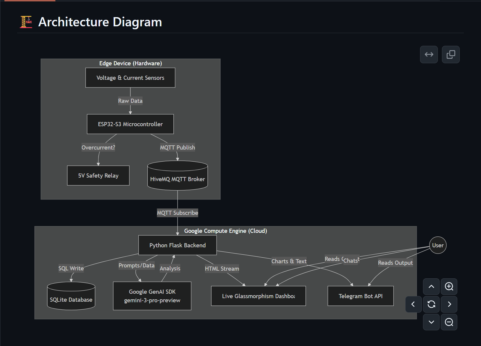 AI Energy Auditor (Gemini API): The most powerful feature. The backend compiles historical sensor data, fault logs, and usage statistics, and sends them to the Google Gemini Pro API with a carefully engineered prompt that forces it to act as a Senior Energy Analyst — not a generic chatbot. It produces a deeply detailed, statistically grounded plain-language energy report. A matplotlib chart is generated alongside this analysis, and the entire multi-modal report is autonomously delivered to the user's Telegram app.