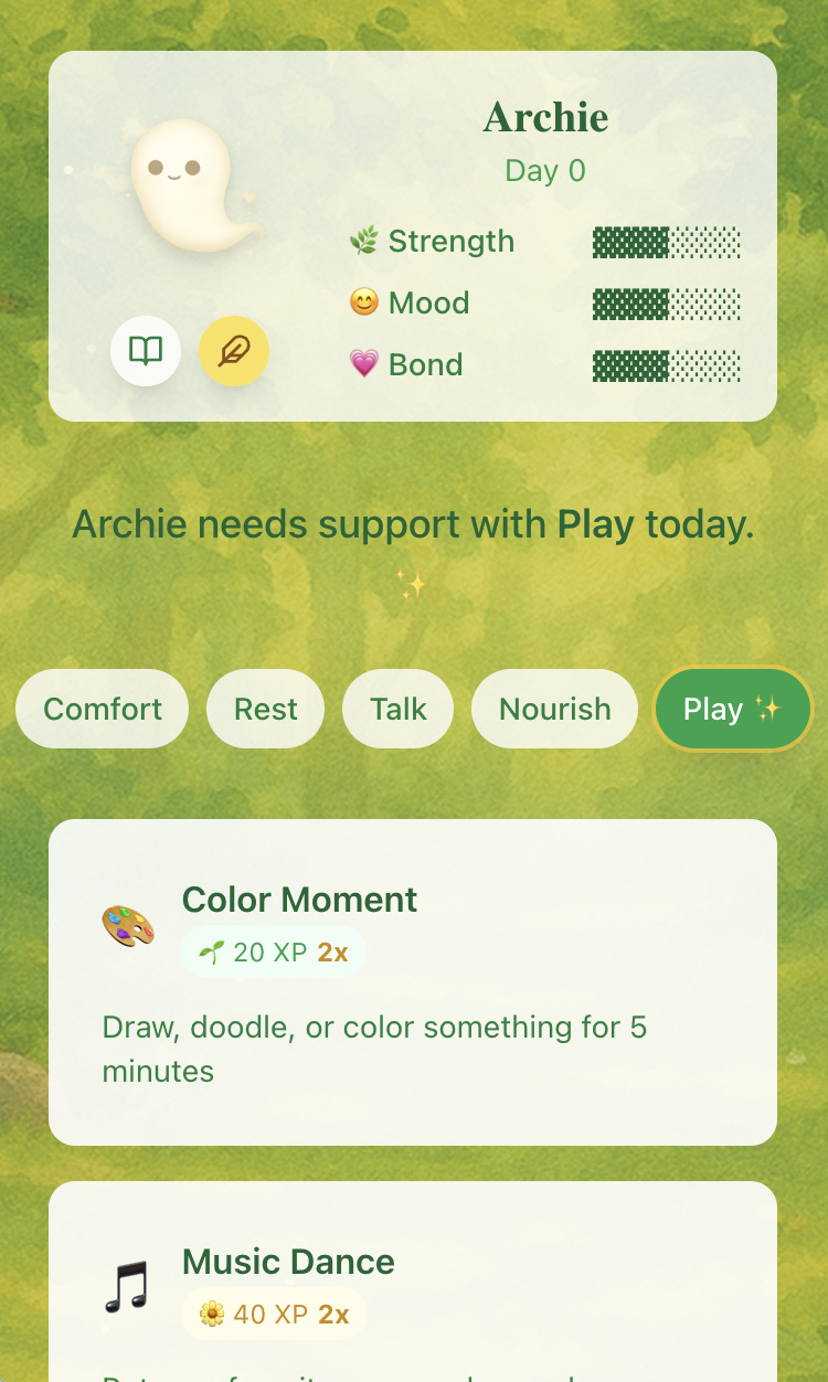 - Daily Needs: Each day, the pet expresses a stronger need (e.g., rest, comfort, play), mirroring how human needs fluctuate -Self-Care Actions: Players choose from grief-informed micro-actions to meet the pet’s need