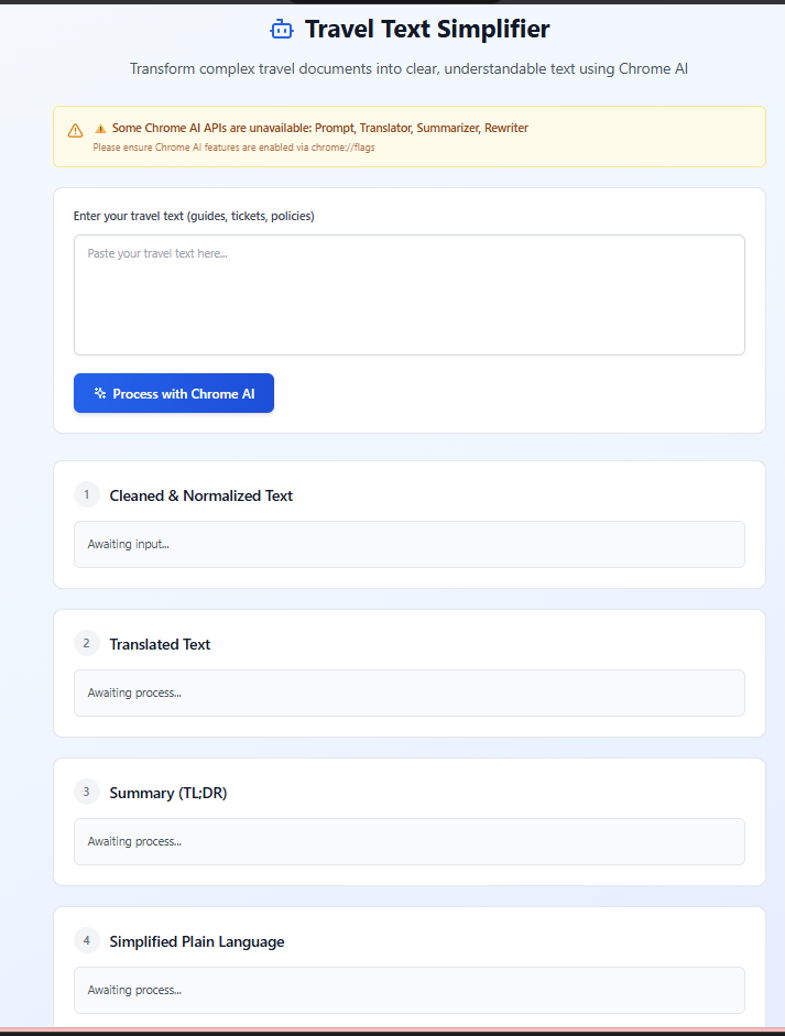 Travel & Accessibility Companion is a Chrome extension that transforms complex travel documents into clear, simple language using Chrome's cutting-edge built-in AI APIs. Users can paste any travel-related text—hotel policies, ticket terms, visa requirements, tour descriptions—and the extension automatically: