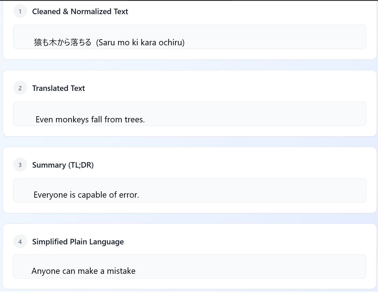 Cleans and normalizes the text using the Prompt API to fix formatting issues Translates content into English using the Translator API with automatic language detection Summarizes lengthy documents into key points using the Summarizer API Simplifies the language into plain, accessible English using the Rewriter API