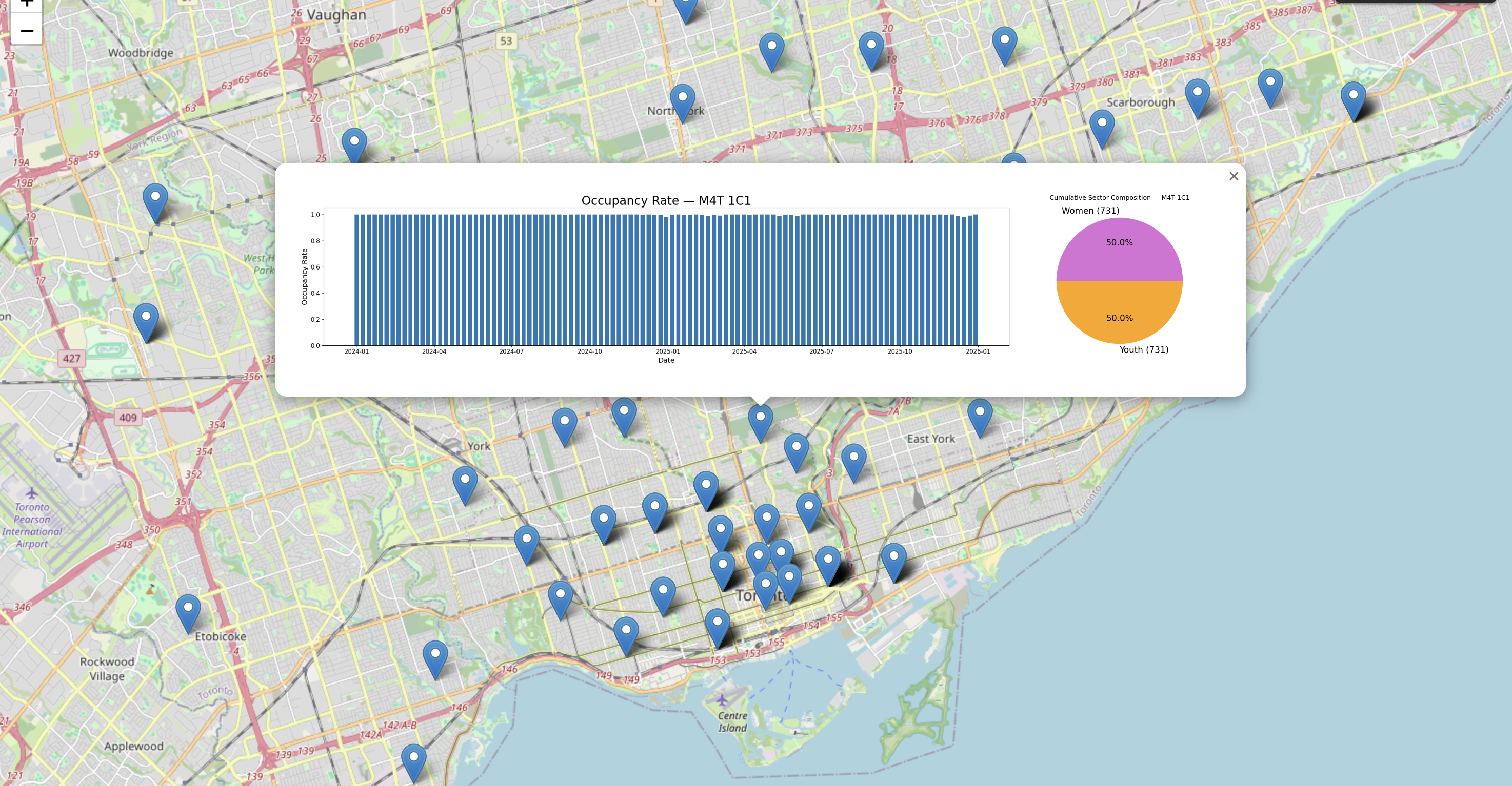 Implement a web app UI for a more seamless user experience Explore more location-based metrics such as shelter-to-shelter walkability, crucial for winters. Add more graphs for easier to access insights Use our model as a function to optimize over Toronto to find locations that are most in need for extra shelters
