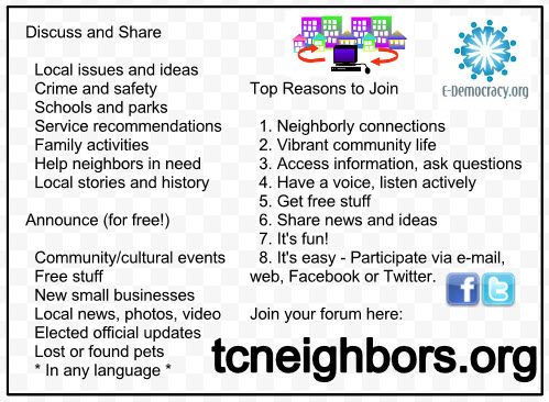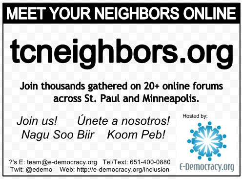 - Solves a real inclusion problem - Nationally according to the Pew Internet and American Life Project's Neighbors Online study, adult Internet users in households making over the $75,000 a year are at least 5 times more likely to join their neighbors via online e-mail lists and forums (15%) than someone from a family making $50,000 (3%) or less or Latino (2%) for example. This is "of" Internet users. Our mix of technology and approach is demonstrating that all communities can benefit from dynamic two way community information exchange by developing and sharing lessons for how to effectively reach those communities being left behind online when it comes to raising community voices and sharing government information in a way that actually impacts people's daily lives and hopes for their community. More Current develop efforts underway include leveraging the Facebook Registration plug-in to allow another easy route for online signing up, further mobile interface development, and developing ideas that complement our very public (open, accessible, accountable) online spaces with nearest neighbor private group communication. Unlike many apps which have few roots and no path beyond a competition to sustain themselves, our Issues Forum approach has evolved since 1994 and has thousands of users. Also important is our open source approach to sharing our lessons so our approaches may be integrated with other technologies and projects. We have a new forum manager training video that goes in-depth into our installation of the GroupServer tool from a "Forum Manager" or group administrator perspective. It is about 45 minutes in length. Government data alone is boring and simply does not attract most people in isolation. The data sets available are not truly local enough to be relevant to a specific diverse communities in a unique way any more than than everyone is interested in road closures or crime data. The government information that empowers people to shape their community, seek solutions and government spending that better serve their needs, etc. is often nuanced and available through people in the political process. As a civic engagement project, our Issues Forum model breaks through this problem by combining a diverse community audience with the ability to share of the local information desired of this competition. Indeed, such information is shared and crucially used by diverse communities everyday. Additional Videos Hmong Outreach Video Cedar Riverside Outreach - Six Languages Brief Video from Steven Clift