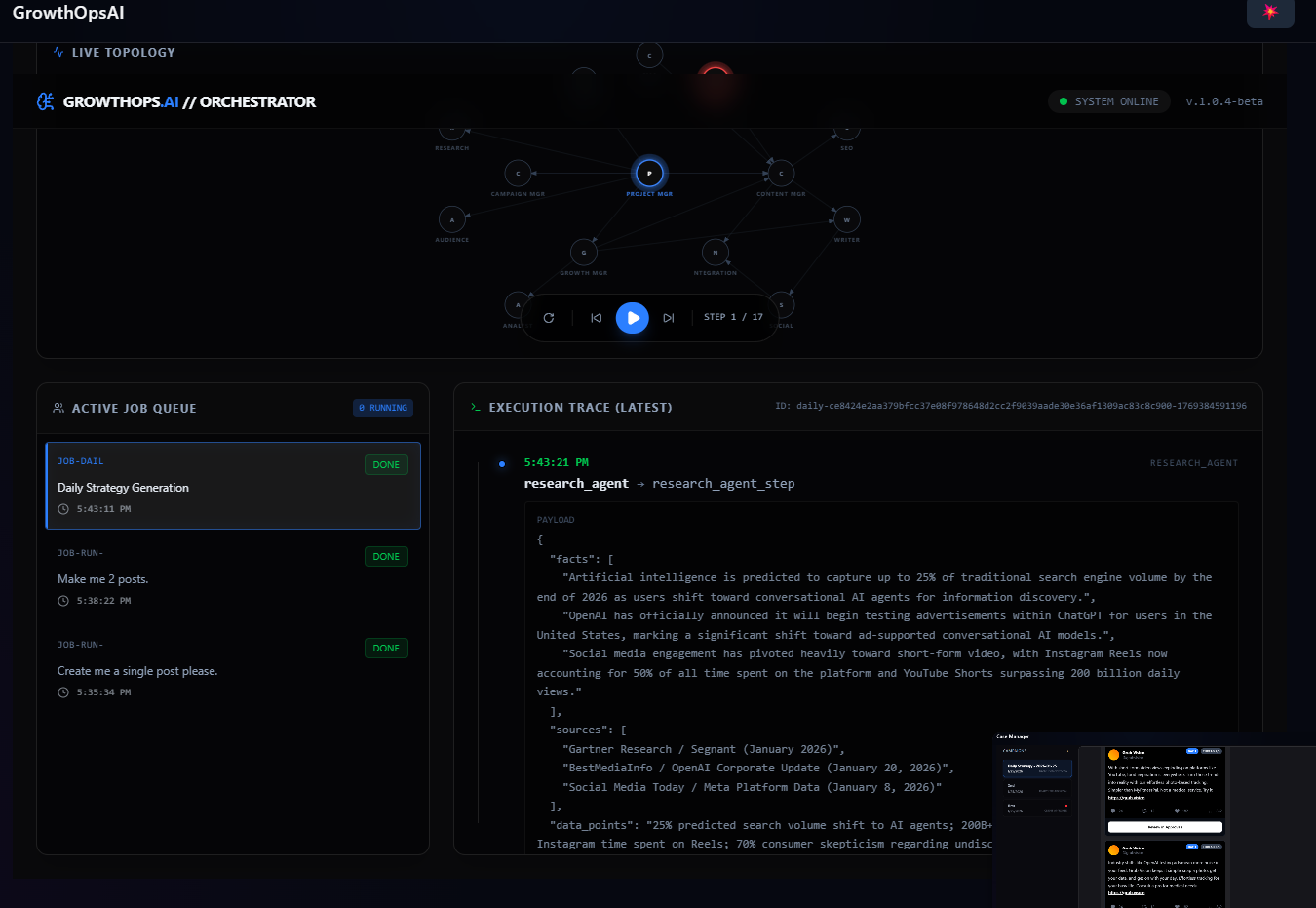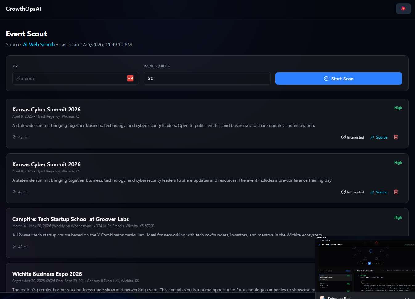 Instead of learning marketing frameworks, writing copy, scouting events, and managing approvals, I wanted to build a system that could do those things on its own. GrowthOpsAI is the result of trying to replace marketing busywork with software.