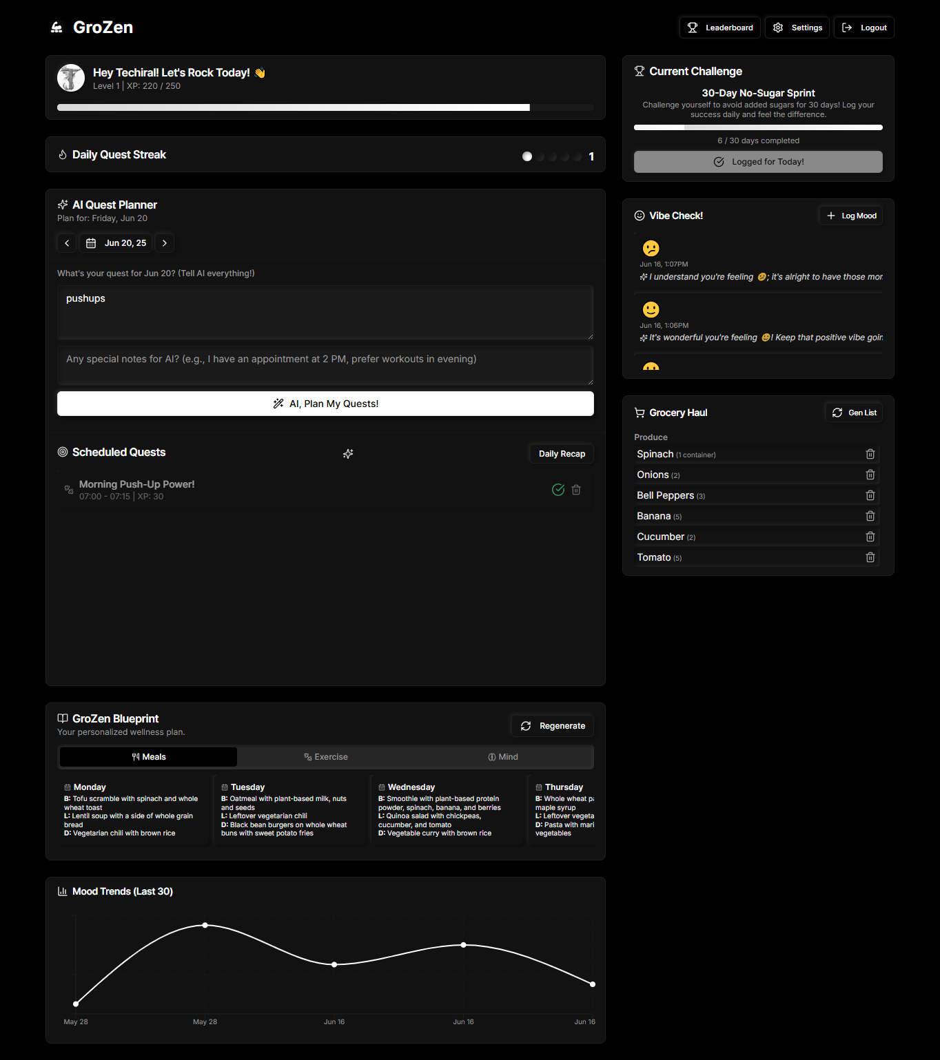 - Firebase for storing user data (quests, wellness plans, mood logs, grocery hauls, leaderboards)