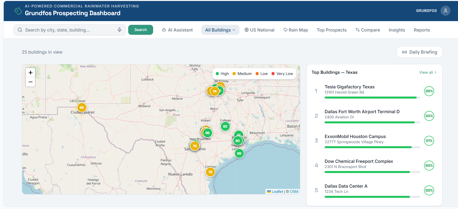 The Grundfos AI Prospecting Engine is an intelligent, data-driven platform that automatically identifies, scores, and ranks commercial buildings for rainwater harvesting potential so your sales team walks into every conversation armed with numbers, not guesses.