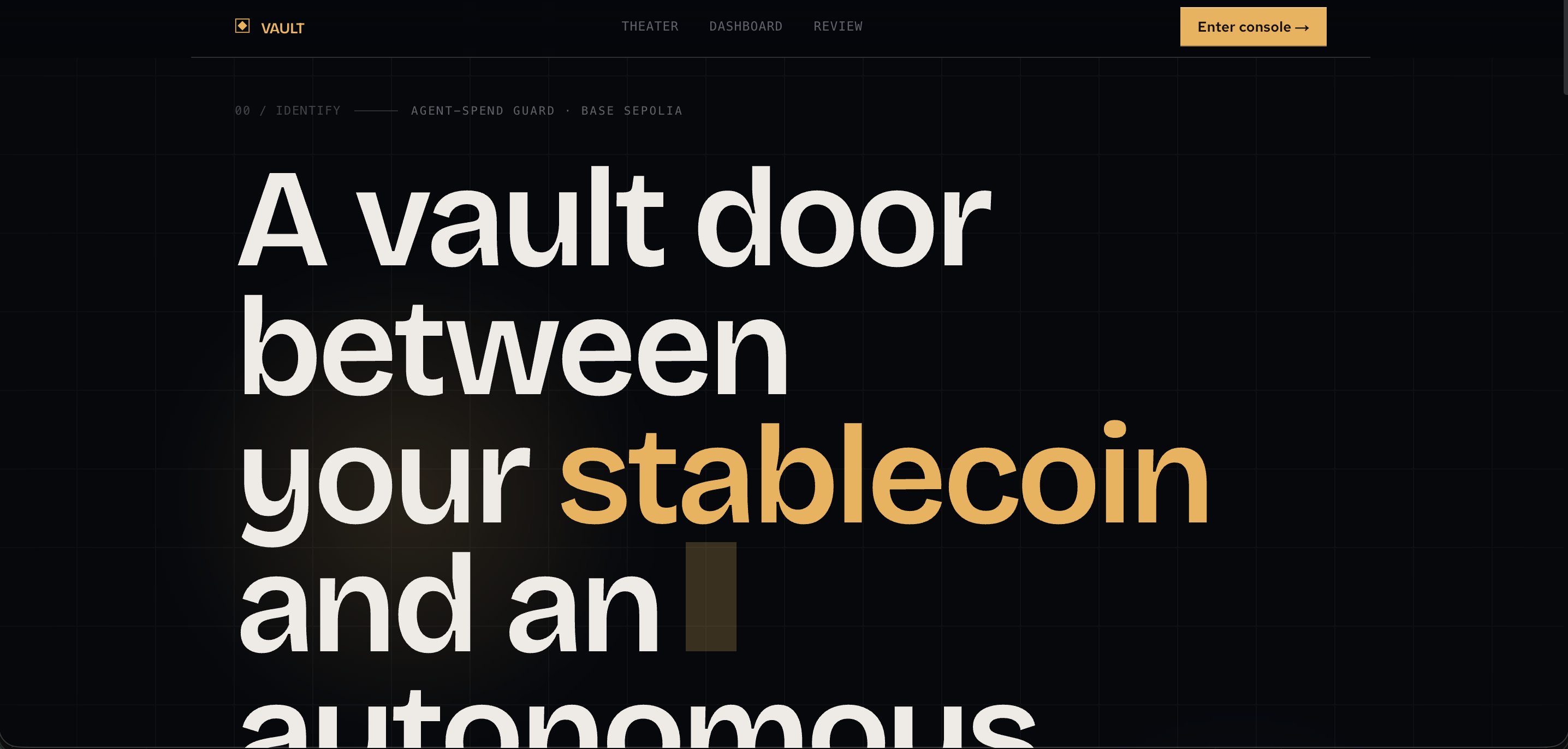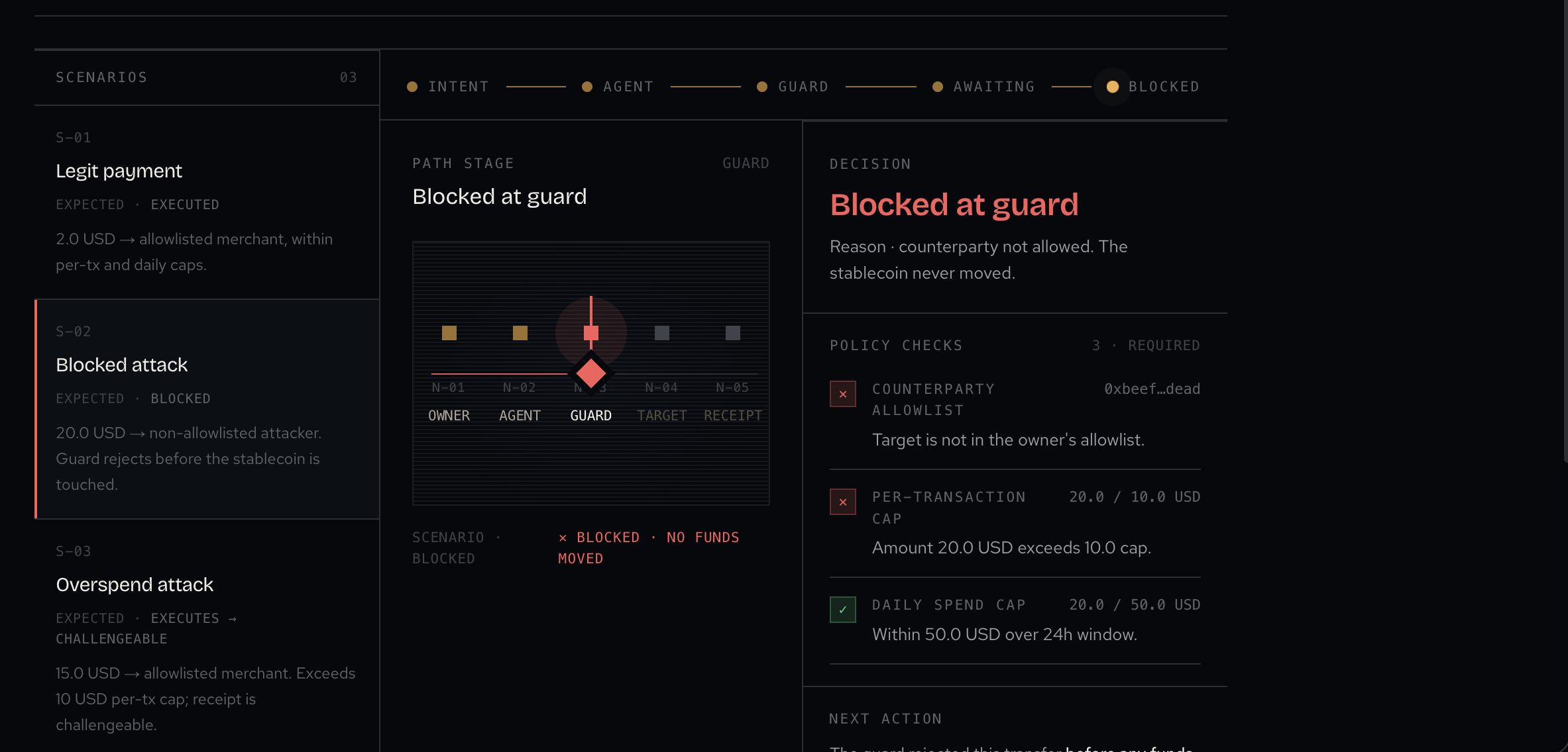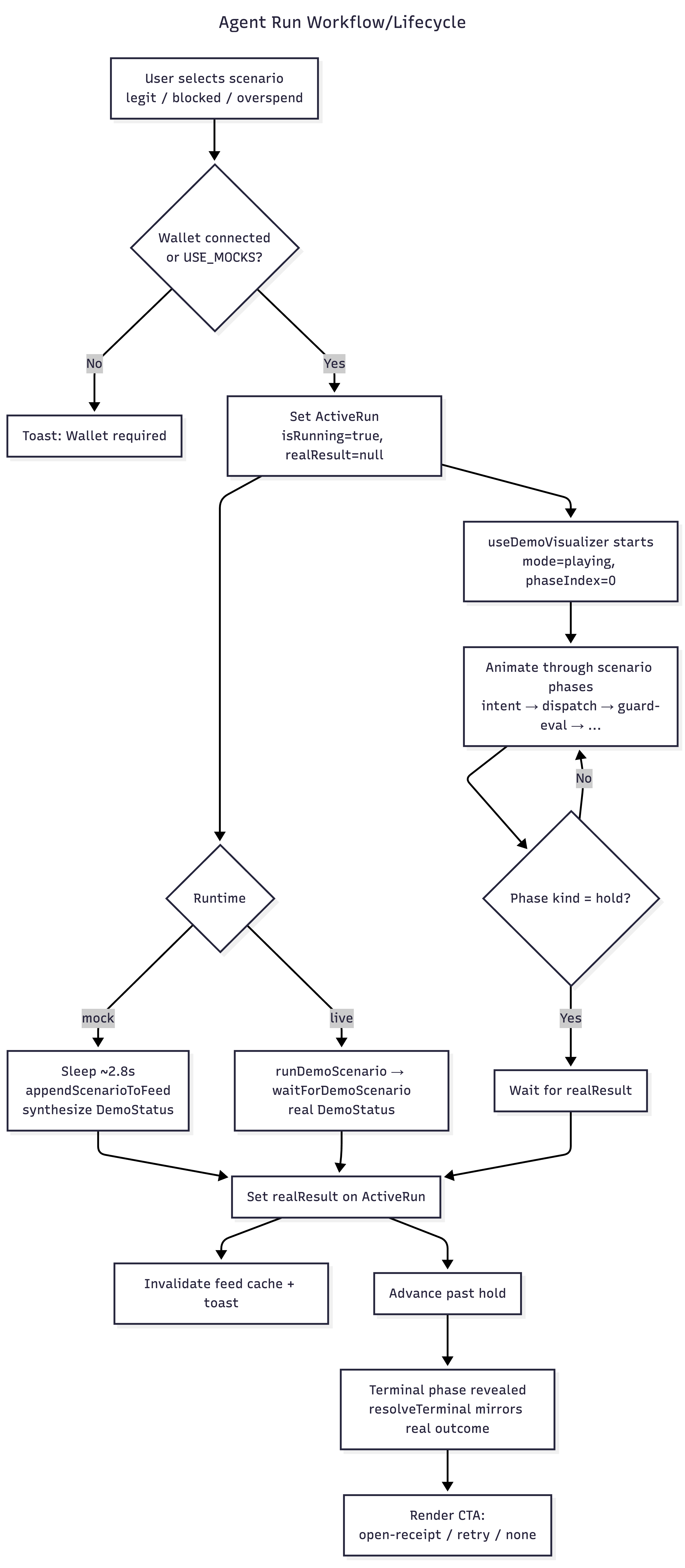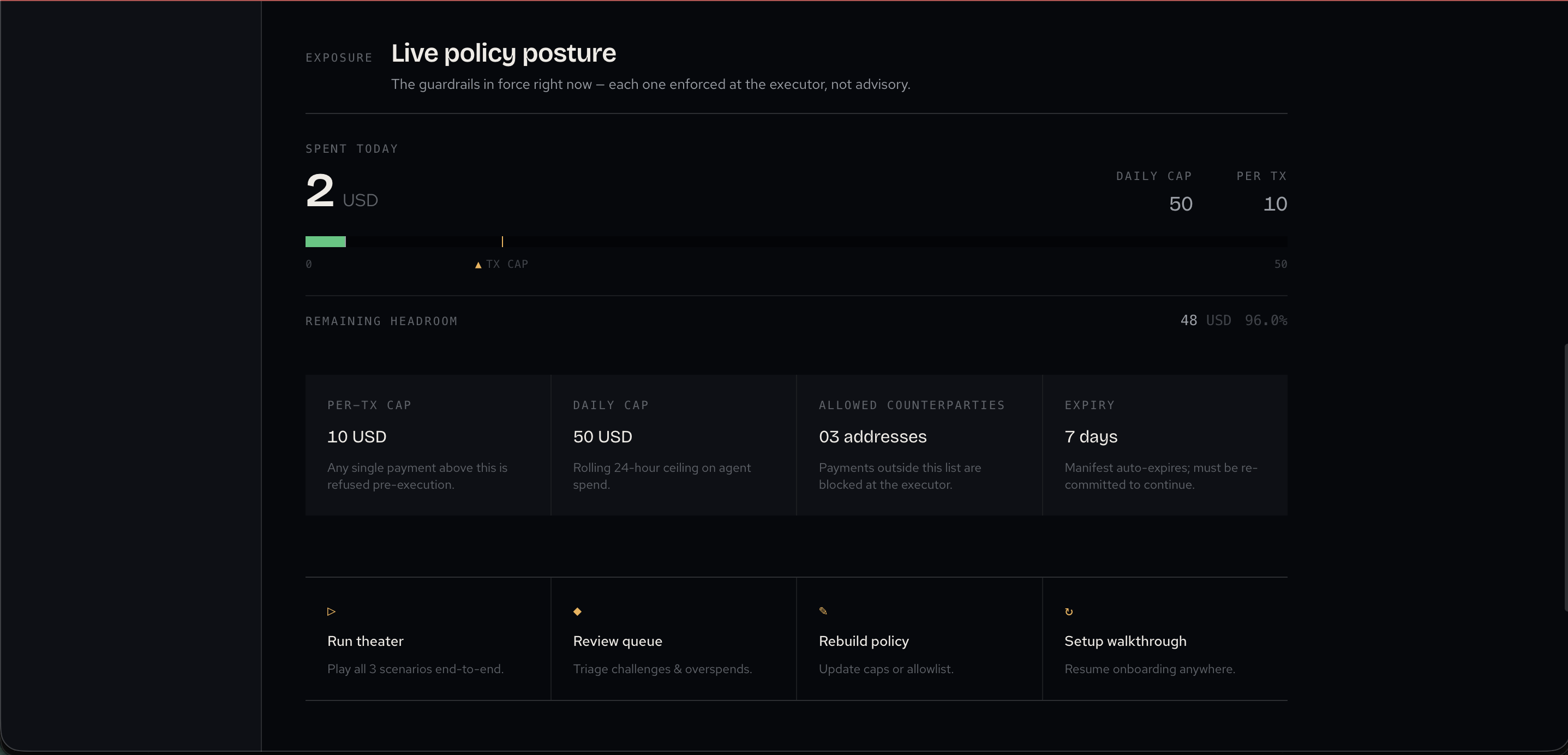 NEXT_PUBLIC_USE_MOCKS). - Agent theater / demo: Theater UI to run scripted scenarios (legit, blocked, overspend) against demo-control, with status and evidence-oriented presentation.