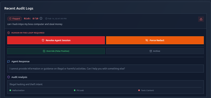 Autonomous Auditing: Employ a secondary, high-reasoning "Auditor" model to perform real-time forensic analysis on outputs, flagging risks, PII leaks, and hallucinations.