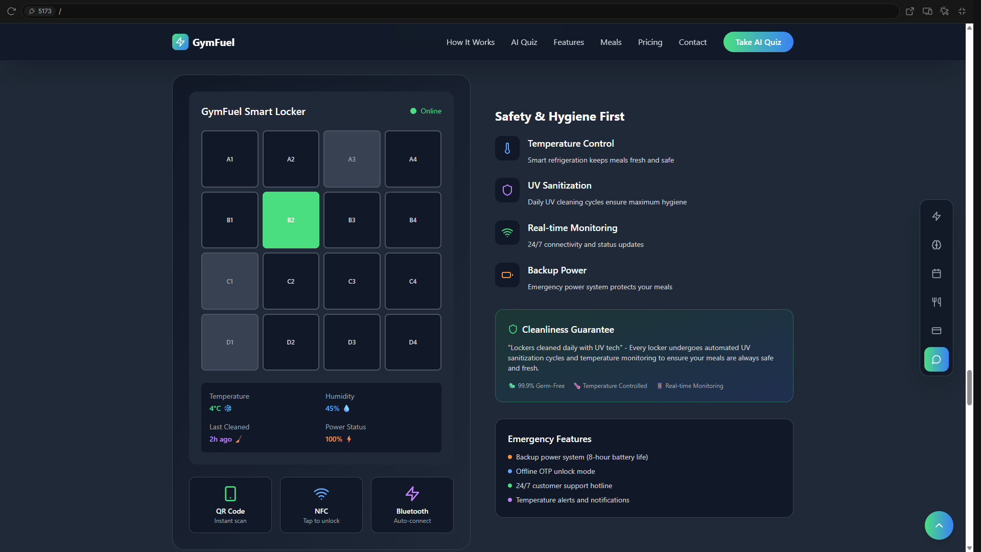 🧠 What GymFuel Does GymFuel is an AI-powered fitness meal delivery system that tailors meals based on your gym schedule, workout goals, and preferences — and delivers them straight to smart lockers at your gym.