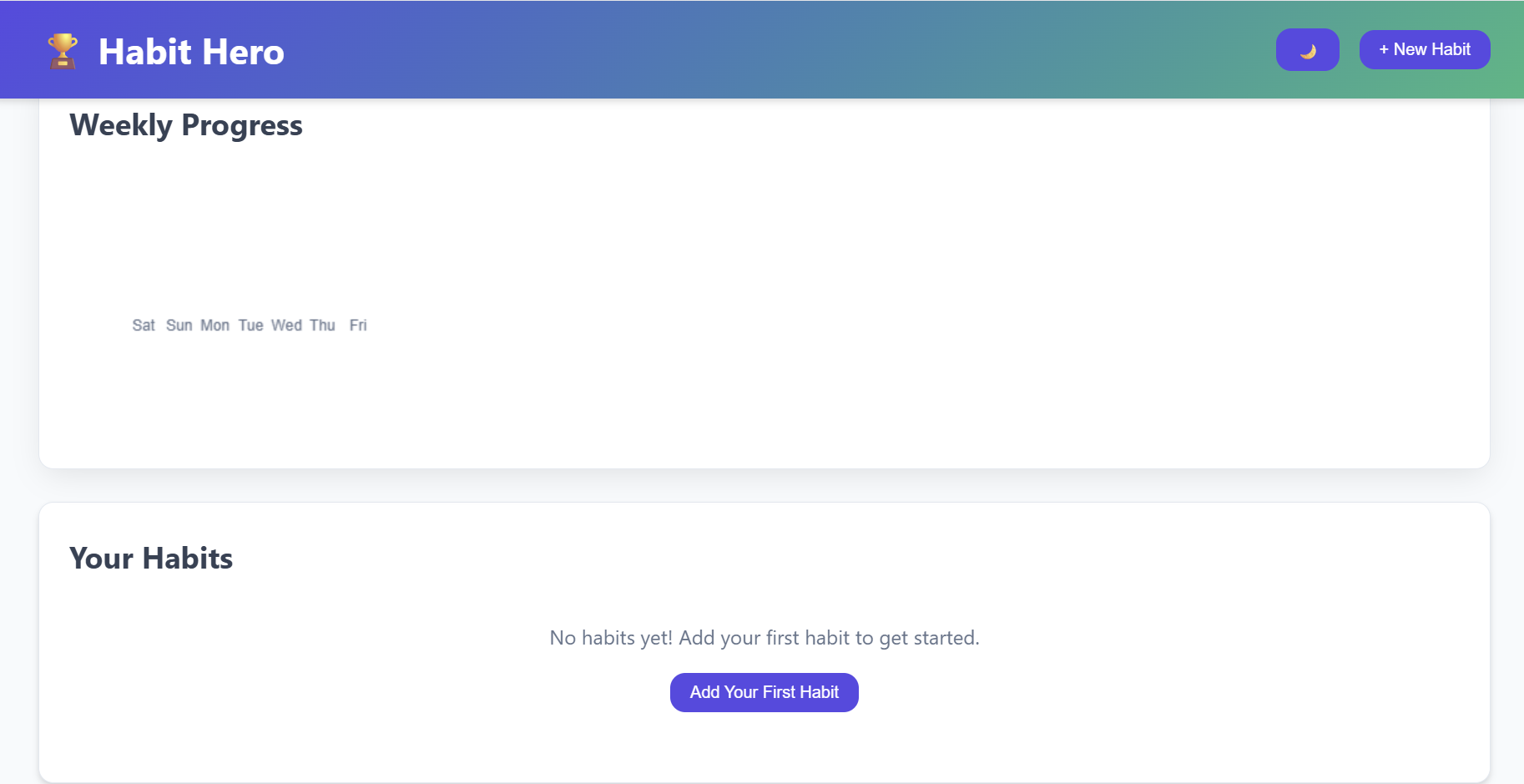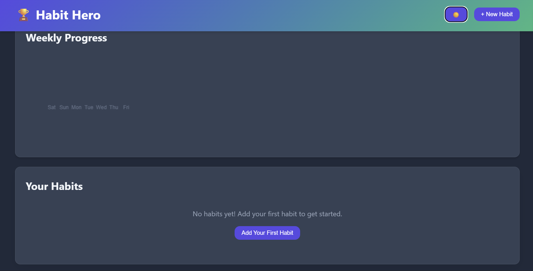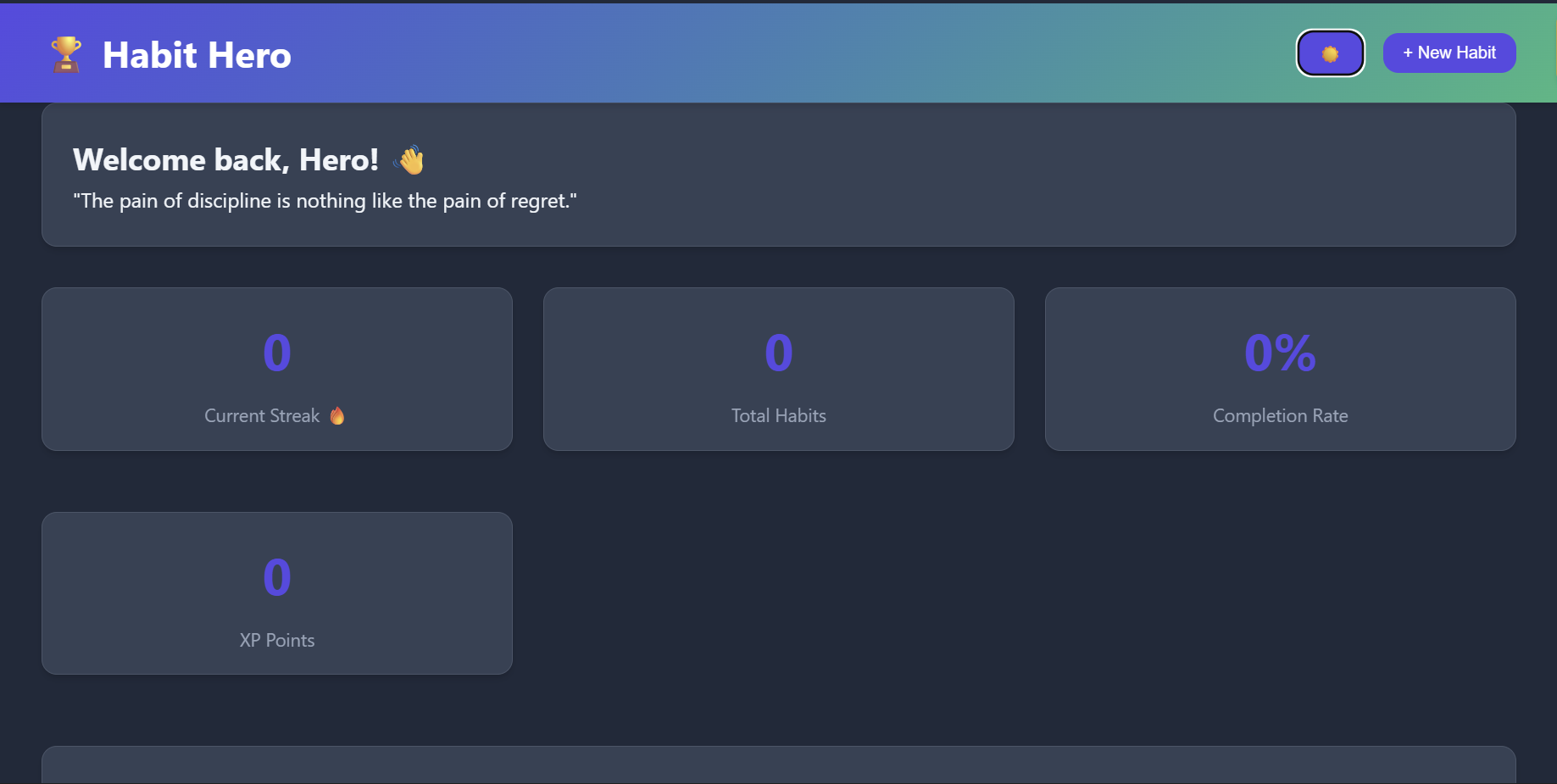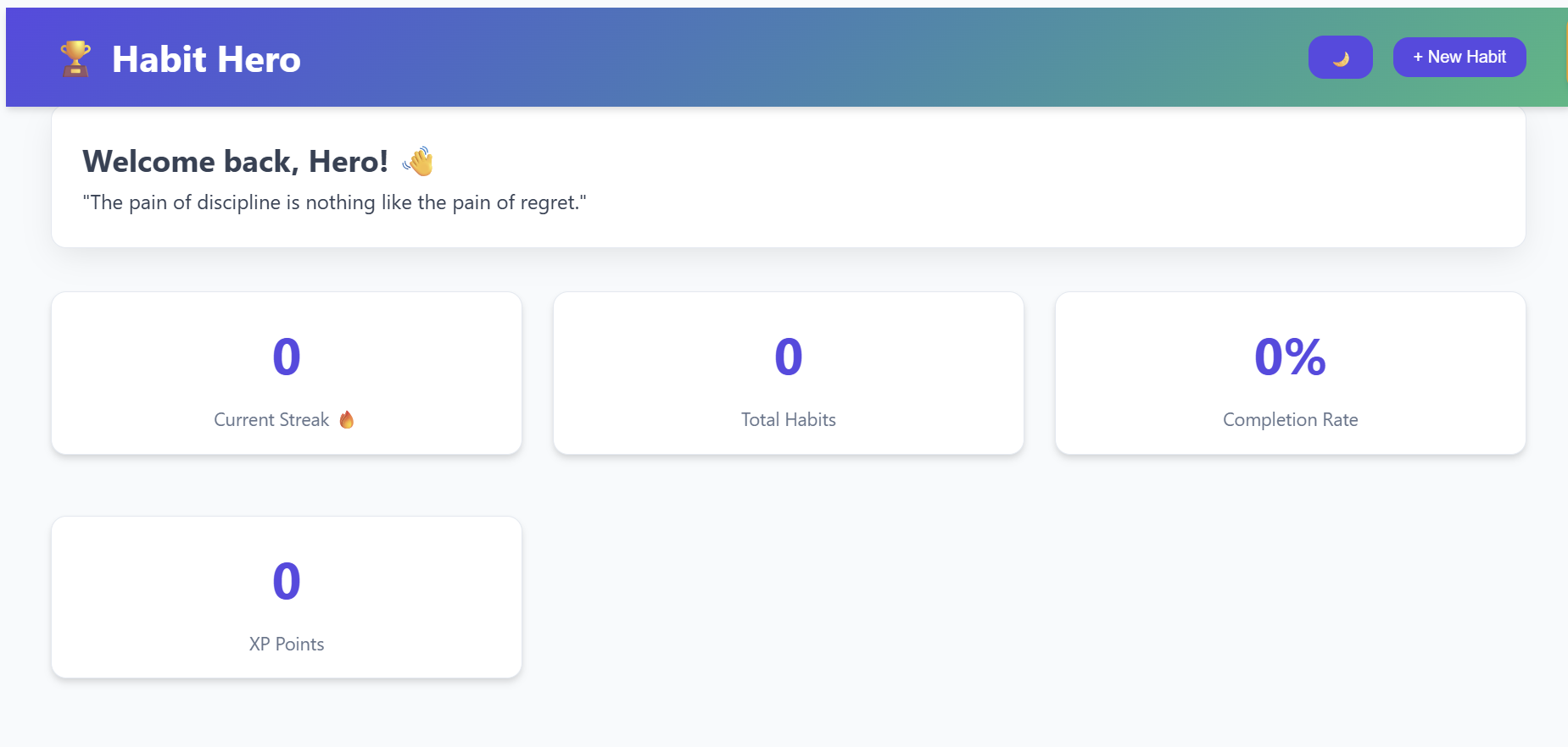 - Stats Dashboard: Displays your current streak, total habits, daily completion rate, and XP points.