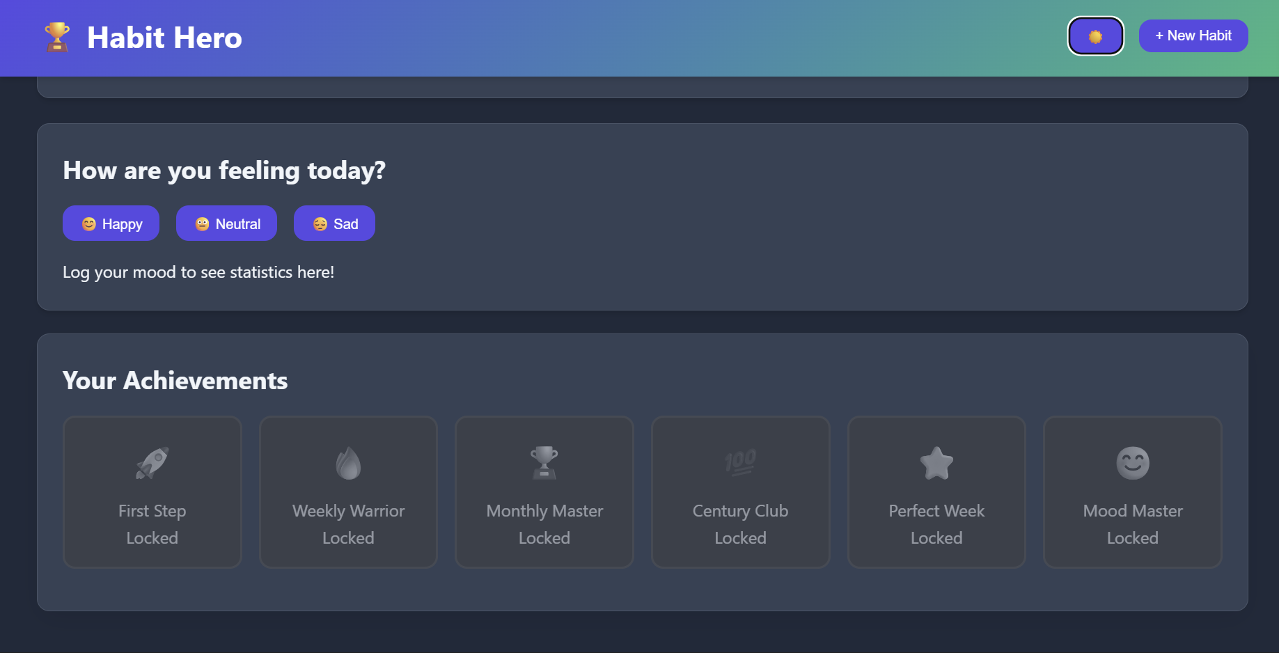 - Achievements & Badges: Unlock rewards such as First Habit, 7-Day Streak, Perfect Week, and more.