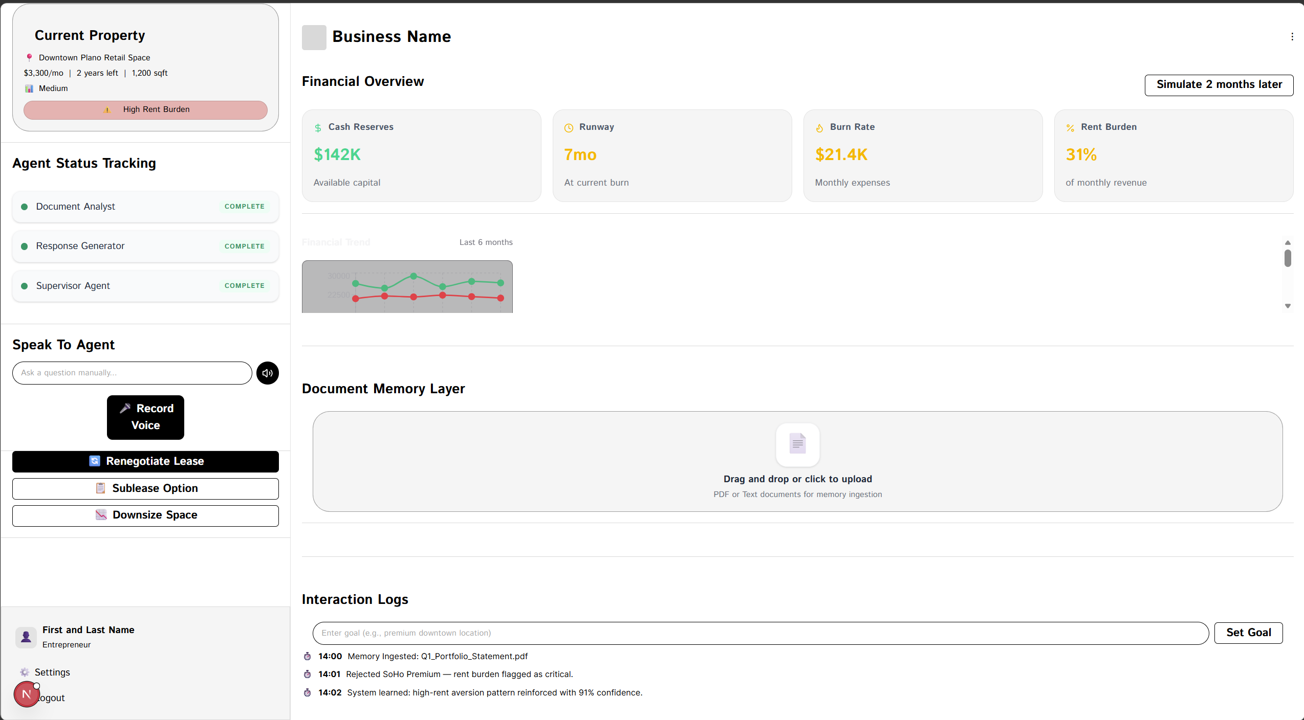 We are proud of building a truly adaptive multi-agent system where the agents share a unified memory. Achieving the Document Memory Layer allows users to simply drag-and-drop a lease or financial doc and receive a deterministic, high-quality advisor report that feels like it has years of context about their specific business needs.