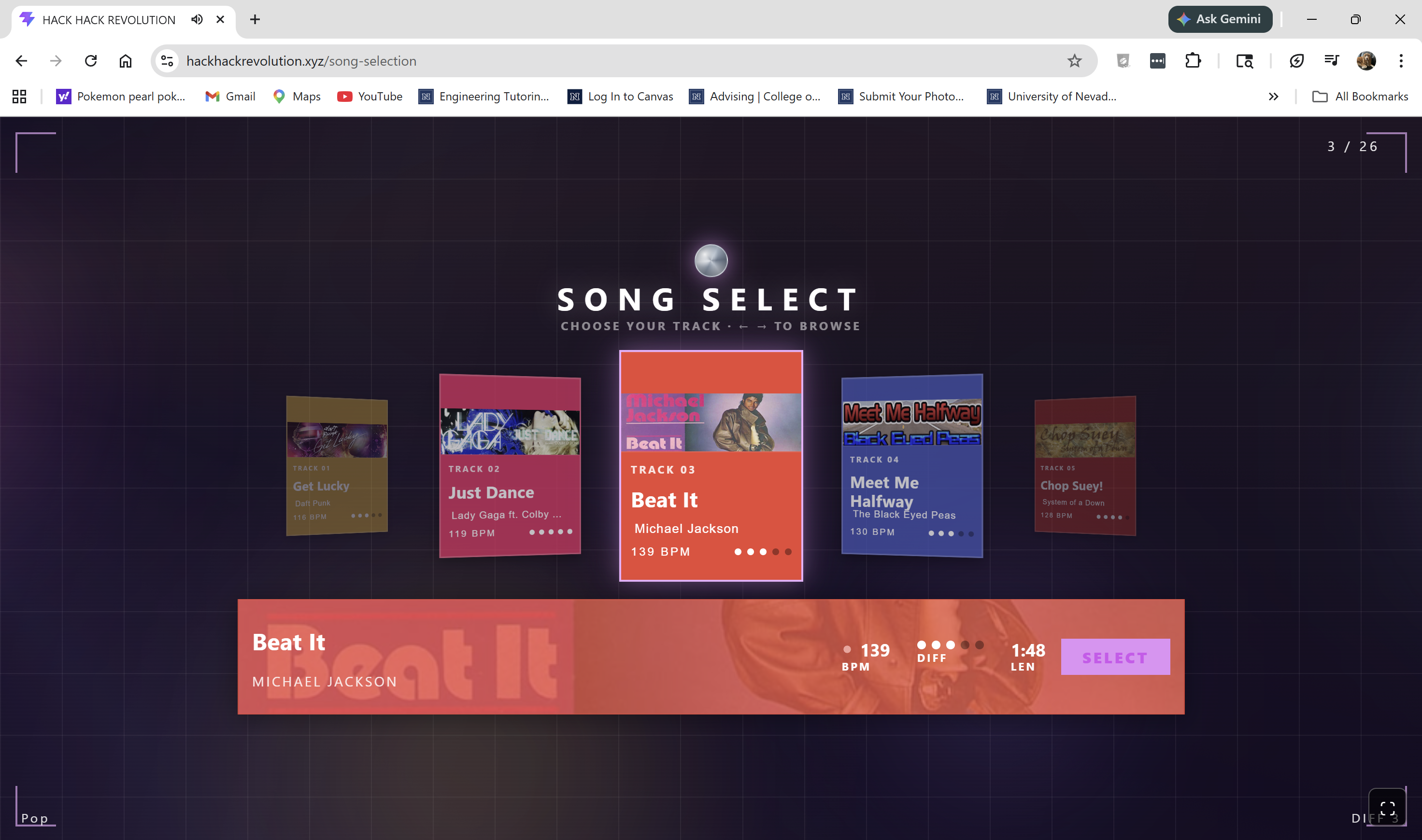 Hack Hack Revolution is a browser-based DDR-style rhythm game that uses your device's camera to track your feet and body in real time. Before playing, the game walks you through a short tutorial. You pick a song and play a full rhythm game using your whole body, scored and timed just like the classic arcade experience.