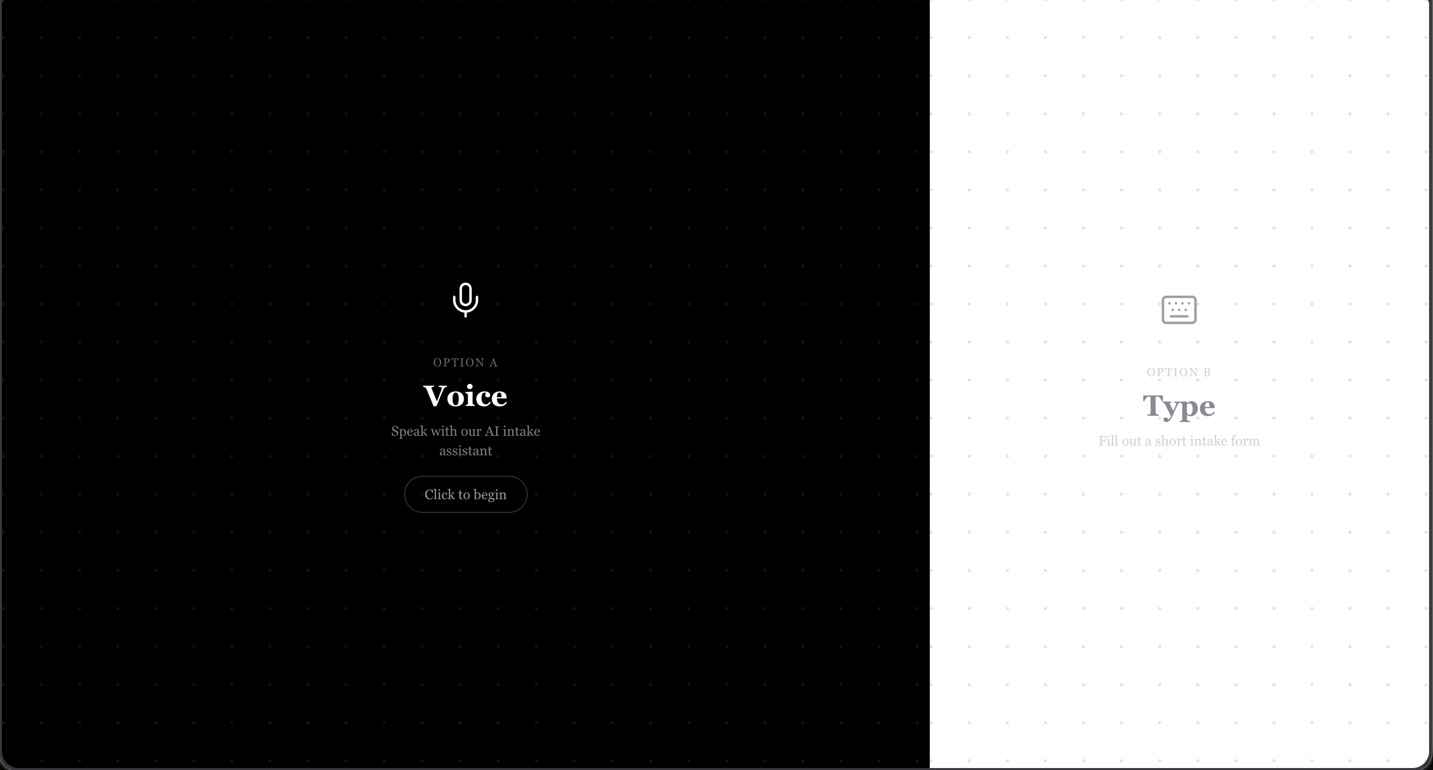 Balancing the split-screen intake UX on both desktop and mobile required several iterations, and getting the page transitions to feel smooth rather than jarring took more care than anticipated.