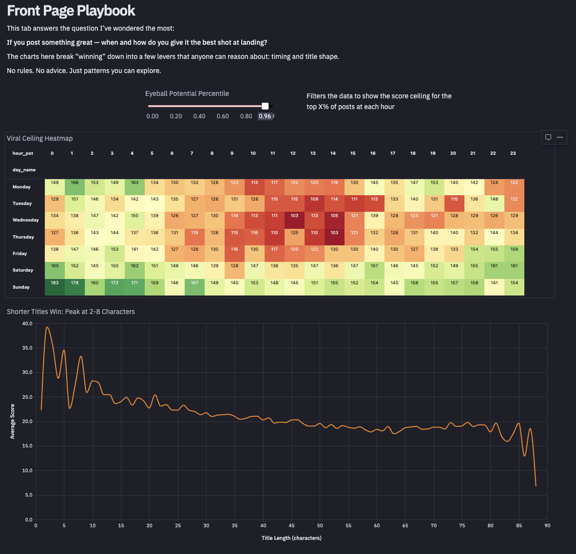 I started by ingesting every post from Jan 2020 to Dec 2025. I crunched 1.8 million rows to find the baseline patterns. I built a "Viral Ceiling" heatmap—not to tell you when to post, but to show you when the "upvote cap" is historically highest (spoiler: it’s not when you think).