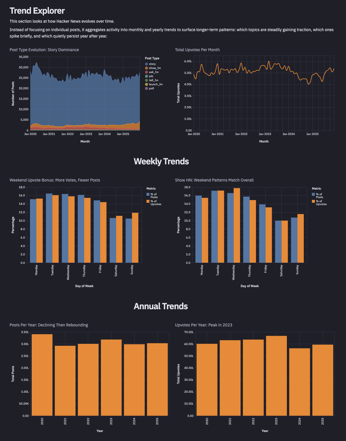 Beyond prediction, I wanted to see how the community has evolved. I built a comprehensive data report that tracks the surge in "Show HN" submissions, analyses monthly activity cycles, and breaks down the most successful domains over the last half-decade and more! It turns raw counts into a clear picture of what the community actually cares about.