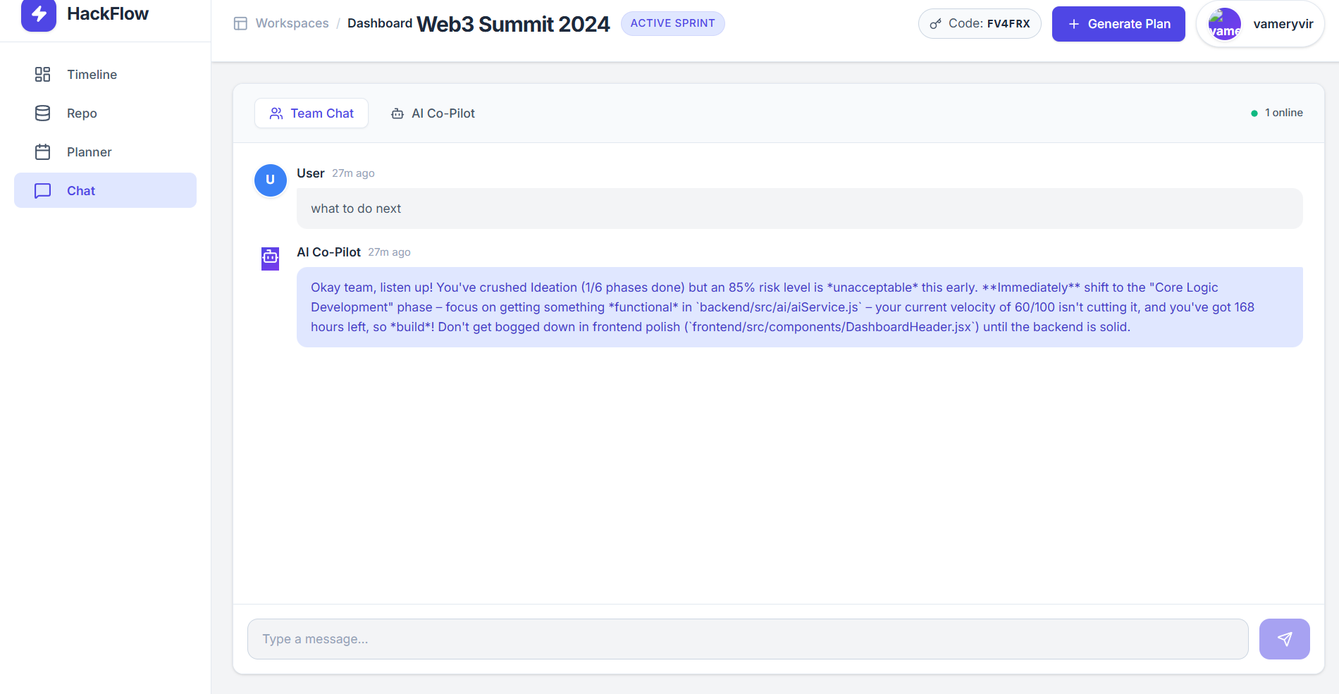 HackFlow AI is an AI-powered workspace dashboard for hackathon teams.