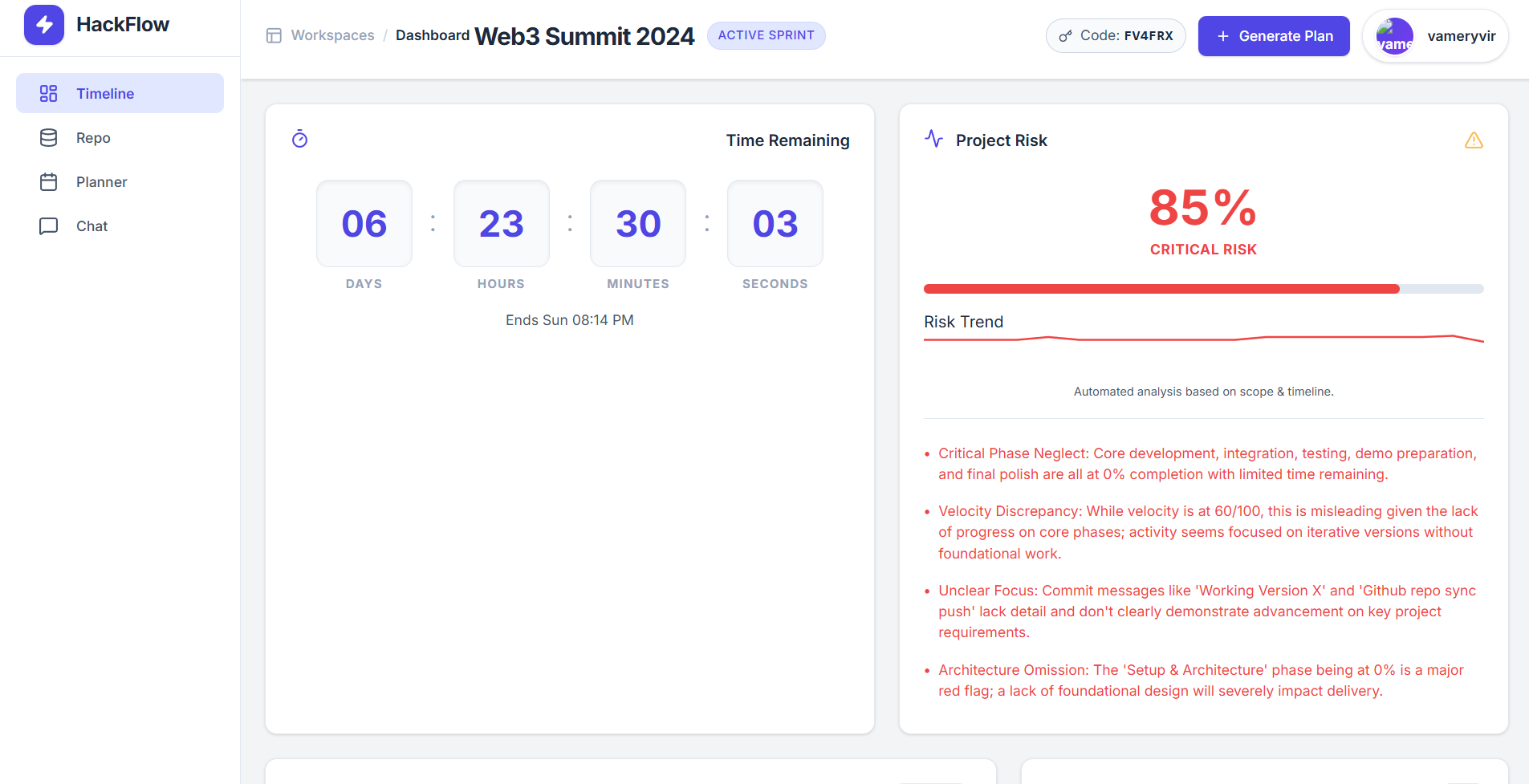 Key features include: A live dashboard with time remaining and risk score An AI-generated plan that teams can customize GitHub repository tracking for real progress A Panic Button that tells teams what to stop and what to finish A context-aware AI co-pilot for time-aware guidance All activity, decisions, and history are preserved so teams can see how their strategy evolves.