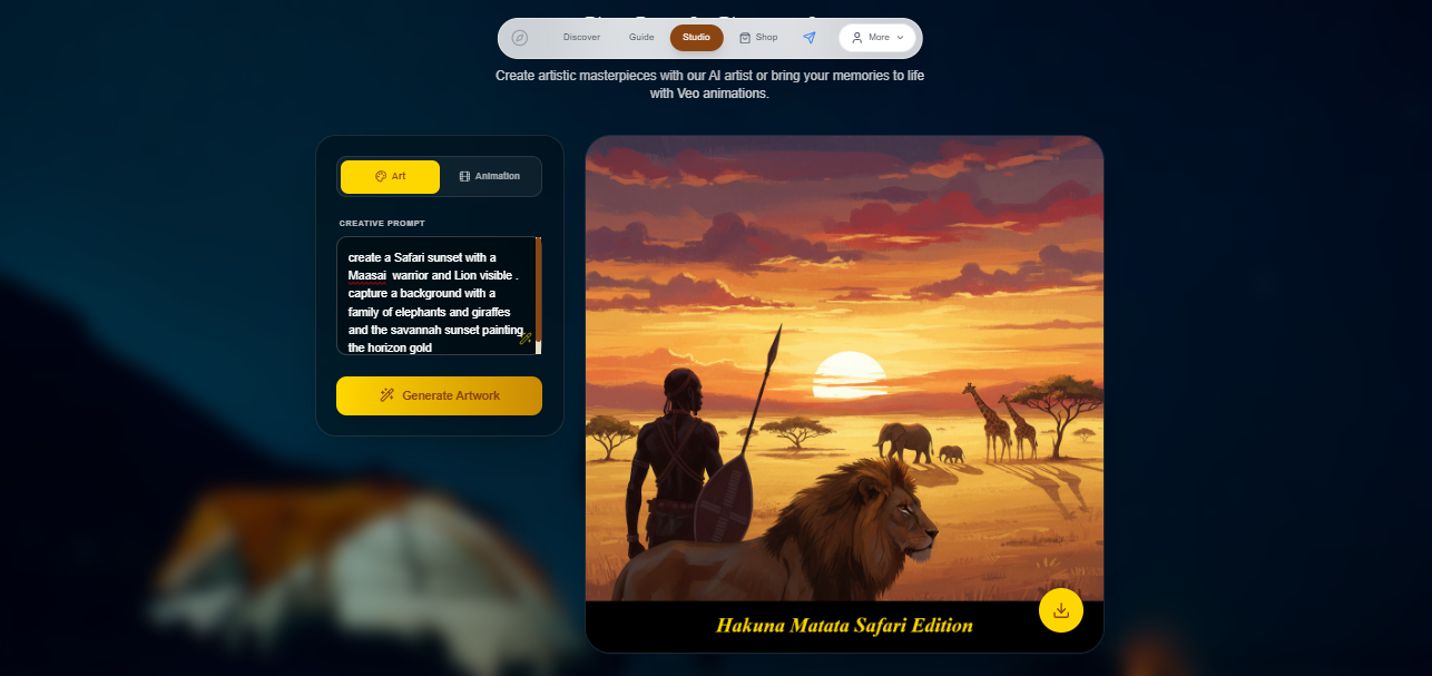 - Multimedia Safari Studio A creative suite for digital memories: AI Art Generation: Uses "Nano Banana" (Gemini 2.5 Flash Image) to create stylized safari concept art from text prompts. Veo Video Animation: Leverages the Veo 3.1 model to animate static images into cinematic, high-definition safari videos.