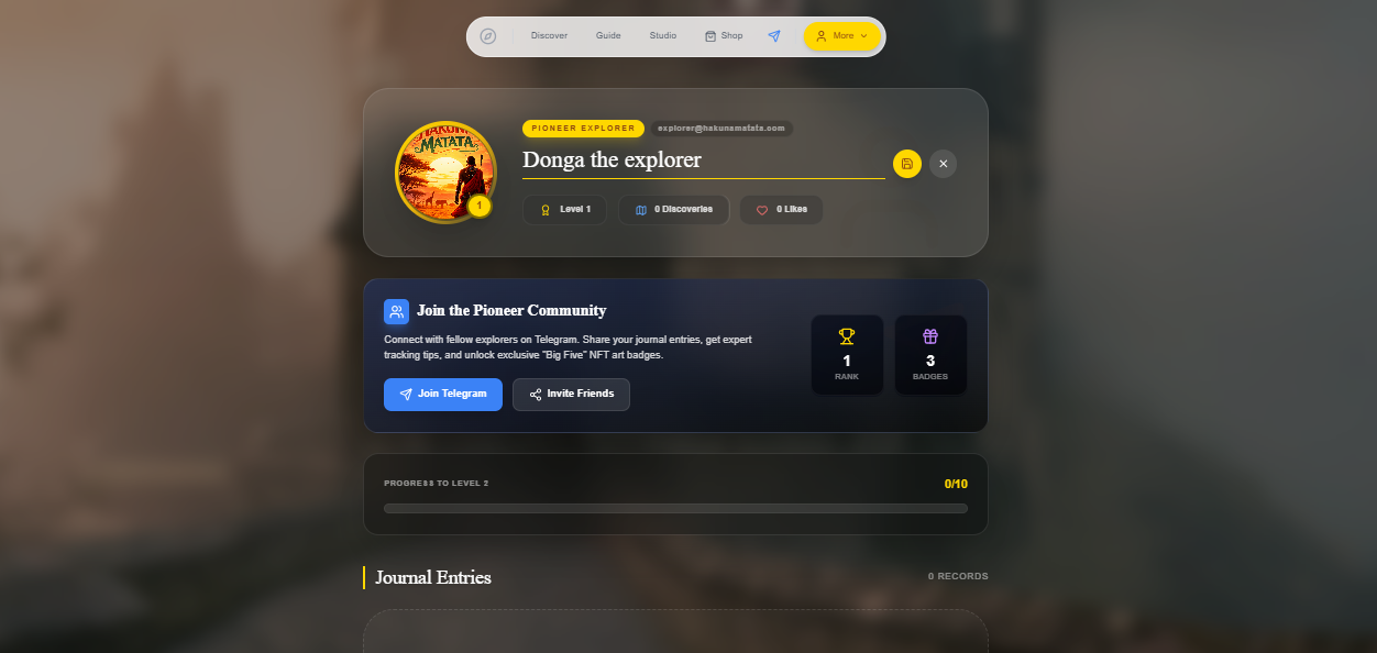 - Digital Explorer Journal A gamified profile system that tracks your progress: Discovery Log: Automatically saves every identified animal or landmark into a personal journal. Leveling System: Users gain "Explorer Levels" as they discover more wildlife. Social & Community: Links to a Telegram community for "Pioneer Explorers" and a curated shop for safari-themed merchandise.