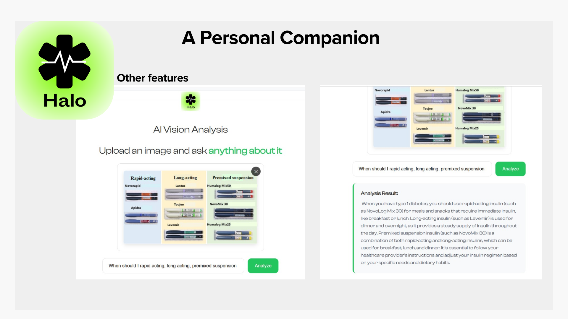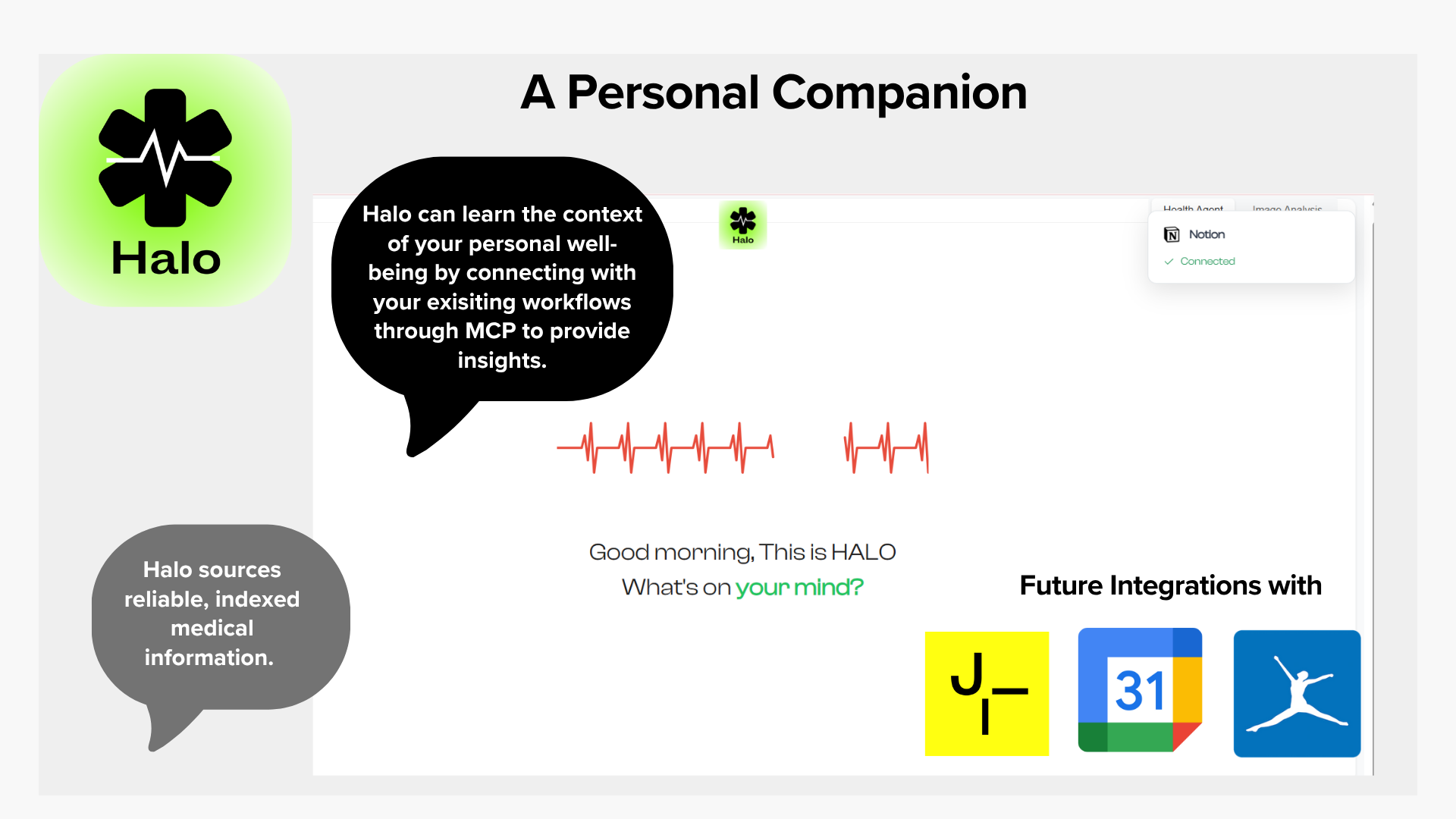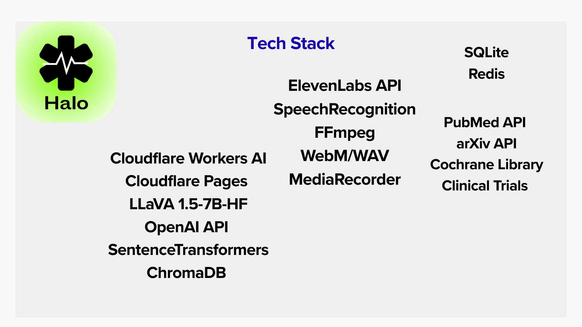 Halo Companion doesn’t just respond to emergencies - it knows YOU. Like Cursor or GitHub Copilot understand the context of your codebase, we wanted Halo Companion to understand your unique health context to deliver personal, life-saving guidance. Built as a full-stack SvelteKit app on Cloudflare Pages, it plugs into your workflows (e.g. Notion) so users can ask, “What was my last meal and how much insulin did I take?” and get instant, relevant answers - also grounded in thousands of indexed medical papers. TypeScript powers the frontend and server routes, which interface with Cloudflare Workers AI. We use LLaVA-1.5-7B-HF for rapid image understanding (e.g., “What are these insulin pens?”) and FormData API for secure file transfer. Our personal health context engine - a “Cursor for health data” - retrieves critical info with minimal latency.